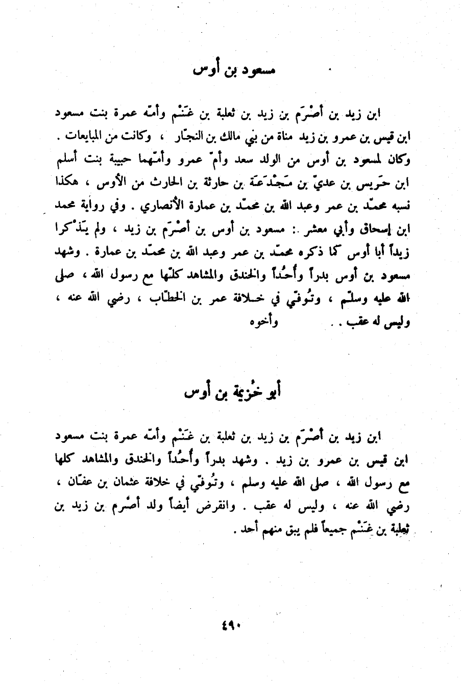 §مَسْعُودُ بْنُ أَوْسِ بْنِ زَيْدِ بْنِ أَصْرَمَ بْنِ زَيْدِ بْنِ ثَعْلَبَةَ بْنِ غَنْمٍ وَأُمُّهُ عَمْرَةُ بِنْتُ مَسْعُودِ بْنِ قَيْسِ بْنِ عَمْرِو بْنِ زَيْدِ مَنَاةَ مِنْ بَنِي مَالِكِ بْنِ النَّجَّارِ، وَكَانَتْ مِنَ الْمُبَايِعَاتِ، وَكَانَ لِمَسْعُودِ بْنِ أَوْسٍ مِنَ الْوَلَدِ سَعْدٌ وَأُمُّ عَمْرٍو، وَأُمُّهُمَا حَبِيبَةُ بِنْتُ أَسْلَمَ بْنِ حَرِيسِ بْنِ عَدِيِّ بْنِ مَجْدَعَةَ بْنِ حَارِثَةَ بْنِ الْحَارِثِ مِنَ الْأَوْسِ. هَكَذَا نَسَبَهُ مُحَمَّدُ بْنُ عُمَرَ وَعَبْدُ اللَّهِ بْنُ مُحَمَّدِ بْنِ عُمَارَةَ الْأَنْصَارِيُّ، وَفِي رِوَايَةِ مُحَمَّدِ بْنِ إِسْحَاقَ وَأَبِي مَعْشَرٍ: مَسْعُودُ بْنُ أَوْسِ بْنِ أَصْرَمَ بْنِ زَيْدٍ وَلَمْ يَذْكُرَا زَيْدًا أَبَا أَوْسٍ كَمَا ذَكَرَهُ مُحَمَّدُ بْنُ عُمَرَ وَعَبْدُ اللَّهِ بْنُ مُحَمَّدِ بْنِ عُمَارَةَ، وَشَهِدَ مَسْعُودُ بْنُ أَوْسٍ بَدْرًا، وَأُحُدًا، وَالْخَنْدَقَ، وَالْمَشَاهِدَ كُلَّهَا مَعَ رَسُولِ اللَّهِ صلّى الله عليه وسلم، وَتُوُفِّيَ فِي خِلَافَةِ عُمَرَ بْنِ الْخَطَّابِ رَضِيَ اللَّهُ عَنْهُ وَلَيْسَ لَهُ عَقِبٌ.