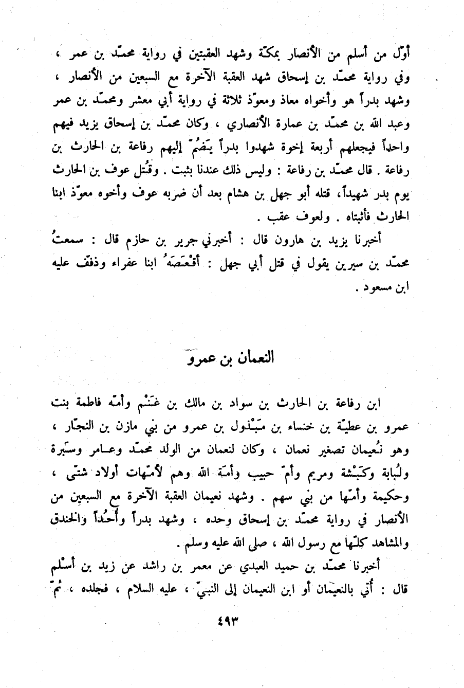 أَخْبَرَنَا يَزِيدُ بْنُ هَارُونَ قَالَ: أَخْبَرَنِي جَرِيرُ بْنُ حَازِمٍ قَالَ: سَمِعْتُ مُحَمَّدَ بْنَ سِيرِينَ يَقُولُ فِي قَتْلِ أَبِي جَهْلٍ: «§أَقْعَصَهُ ابْنَا عَفْرَاءَ، وَذَفَّفَ عَلَيْهِ ابْنُ مَسْعُودٍ»