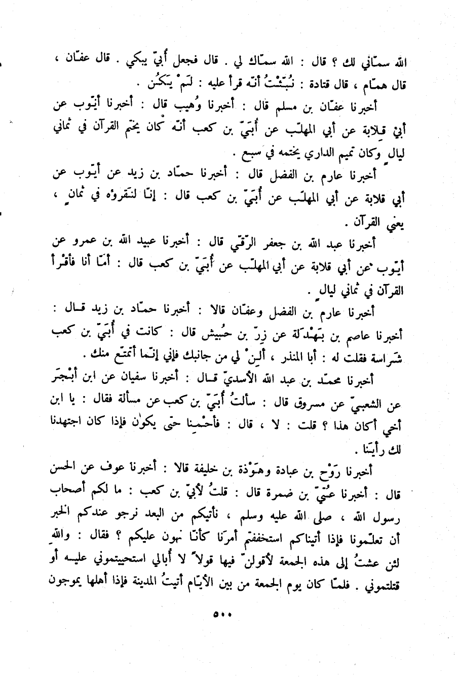 أَخْبَرَنَا عَفَّانُ بْنُ مُسْلِمٍ قَالَ: أَخْبَرَنَا وُهَيْبٌ قَالَ: أَخْبَرَنَا أَيُّوبُ، عَنْ أَبِي قِلَابَةَ، عَنْ أَبِي الْمُهَلَّبِ، عَنْ أُبَيِّ بْنِ كَعْبٍ: «أَنَّهُ §كَانَ يَخْتِمُ الْقُرْآنَ فِي ثَمَانِي لَيَالٍ، وَكَانَ تَمِيمٌ الدَّارِيُّ يَخْتِمُهُ فِي سَبْعٍ»