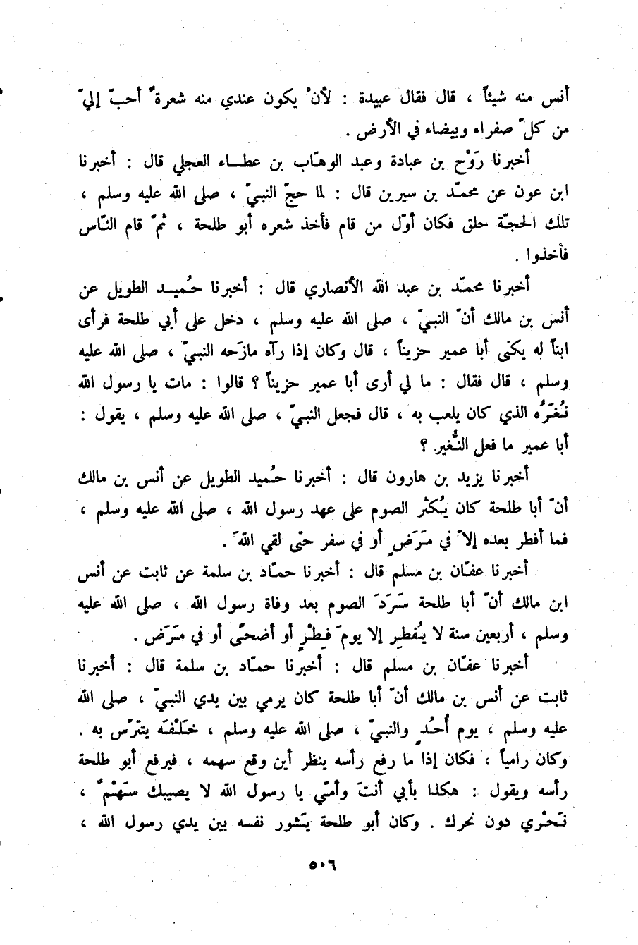 أَخْبَرَنَا عَفَّانُ بْنُ مُسْلِمٍ قَالَ: أَخْبَرَنَا حَمَّادُ بْنُ سَلَمَةَ، عَنْ ثَابِتٍ، عَنْ أَنَسِ بْنِ مَالِكٍ: «أَنَّ أَبَا طَلْحَةَ §سَرَدَ الصَّوْمَ بَعْدَ وَفَاةِ رَسُولِ اللَّهِ صلّى الله عليه وسلم أَرْبَعِينَ سَنَةً لَا يُفْطِرُ إِلَّا يَوْمَ فِطْرٍ، أَوْ أَضْحَى، أَوْ فِي مَرَضٍ»