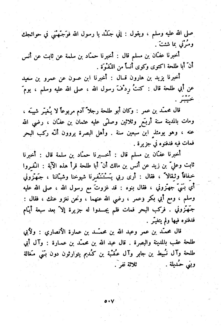 أَخْبَرَنَا عَفَّانُ بْنُ مُسْلِمٍ قَالَ: أَخْبَرَنَا حَمَّادُ بْنُ سَلَمَةَ قَالَ: أَخْبَرَنَا ثَابِتٌ، وَعَلِيُّ بْنُ زَيْدٍ، عَنْ أَنَسِ بْنِ مَالِكٍ: " أَنَّ أَبَا طَلْحَةَ قَرَأَ هَذِهِ الْآيَةَ: {انْفِرُوا خِفَافًا وَثِقَالًا} [التوبة: 41] ، فَقَالَ: «§أَرَى رَبِّي يَسْتَنْفِرُنَا شُيُوخَنَا وَشُبَّانَنَا، جَهِّزُونِي أَيْ بَنِيَّ، جَهِّزُونِي» ، فَقَالَ بَنَوْهُ: قَدْ غَزَوْتَ مَعَ رَسُولِ اللَّهِ صلّى الله عليه وسلم وَمَعَ أَبِي بَكْرٍ وَعُمَرَ رَضِيَ اللَّهُ عَنْهُمَا وَنَحْنُ نَغْزُو عَنْكَ، فَقَالَ: «جَهِّزُونِي» ، فَرَكِبَ الْبَحْرَ فَمَاتَ، فَلَمْ يَجِدُوا لَهُ جَزِيرَةً إِلَّا بَعْدَ سَبْعَةِ أَيَّامٍ فَدَفَنُوهُ فِيهَا وَلَمْ يَتَغَيَّرْ " قَالَ مُحَمَّدُ بْنُ عُمَرَ، وَعَبْدُ اللَّهِ بْنُ مُحَمَّدِ بْنِ عُمَارَةَ الْأَنْصَارِيُّ: وَلِأَبِي طَلْحَةَ عَقِبٌ بِالْمَدِينَةِ وَالْبَصْرَةِ. قَالَ عَبْدُ اللَّهِ بْنُ مُحَمَّدِ بْنِ عُمَارَةَ: وَآلُ أَبِي طَلْحَةَ وَآلُ نُبَيْطِ بْنِ جَابِرٍ وَآلُ عُقْبَةَ بْنِ كُدَيْمٍ يَتَوَارَثُونَ دُونَ بَنِي مَغَالَةَ وَبَنِي حُدَيْلَةَ. ثَلَاثَةُ نَفَرٍ