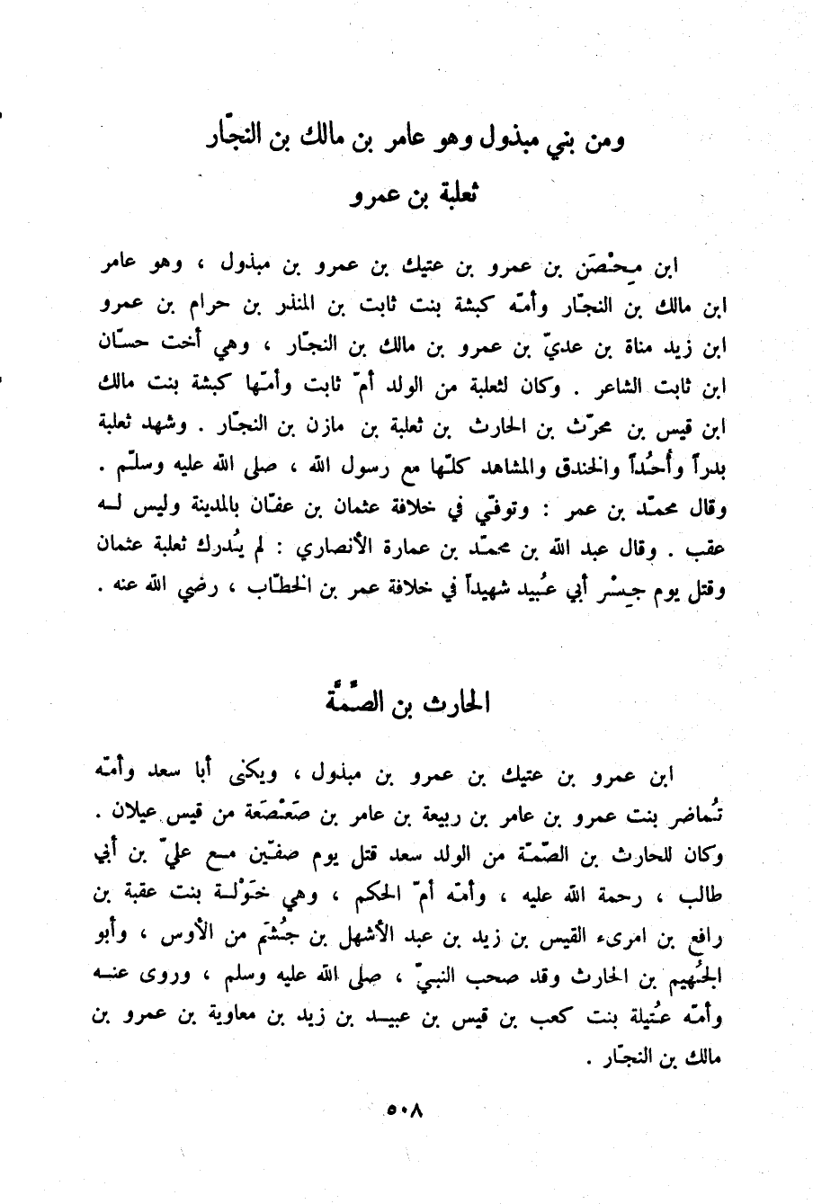 §الْحَارِثُ بْنُ الصِّمَّةِ بْنِ عَمْرِو بْنِ عَتِيكِ بْنِ عَمْرِو بْنِ مَبْذُولٍ وَيُكْنَى أَبَا سَعْدٍ وَأُمُّهُ تُمَاضِرُ بِنْتُ عَمْرِو بْنِ عَامِرِ بْنِ رَبِيعَةَ بْنِ عَامِرِ بْنِ صَعْصَعَةَ مِنْ قَيْسِ عَيْلَانَ، وَكَانَ لِلْحَارِثِ بْنِ الصِّمَّةِ مِنَ الْوَلَدِ سَعْدٌ قُتِلَ يَوْمَ صِفِّينَ مَعَ عَلِيِّ بْنِ أَبِي طَالِبٍ رَحْمَةُ اللَّهِ عَلَيْهِ، وَأُمُّهُ أُمُّ الْحَكَمِ وَهِيَ خَوْلَةُ بِنْتُ عُقْبَةَ بْنِ رَافِعِ بْنِ امْرِئِ الْقَيْسِ بْنِ زَيْدِ بْنِ عَبْدِ الْأَشْهَلِ بْنِ جُشَمَ مِنَ الْأَوْسِ، وَأَبُو الْجُهَيْمِ بْنُ الْحَارِثِ وَقَدْ صَحِبَ النَّبِيَّ صلّى الله عليه وسلم وَرَوَى عَنْهُ، وَأُمُّهُ عُتَيْلَةُ بِنْتُ كَعْبِ بْنِ قَيْسِ بْنِ عُبَيْدِ بْنِ زَيْدِ بْنِ مُعَاوِيَةَ بْنِ عَمْرِو بْنِ مَالِكِ بْنِ النَّجَّارِ.