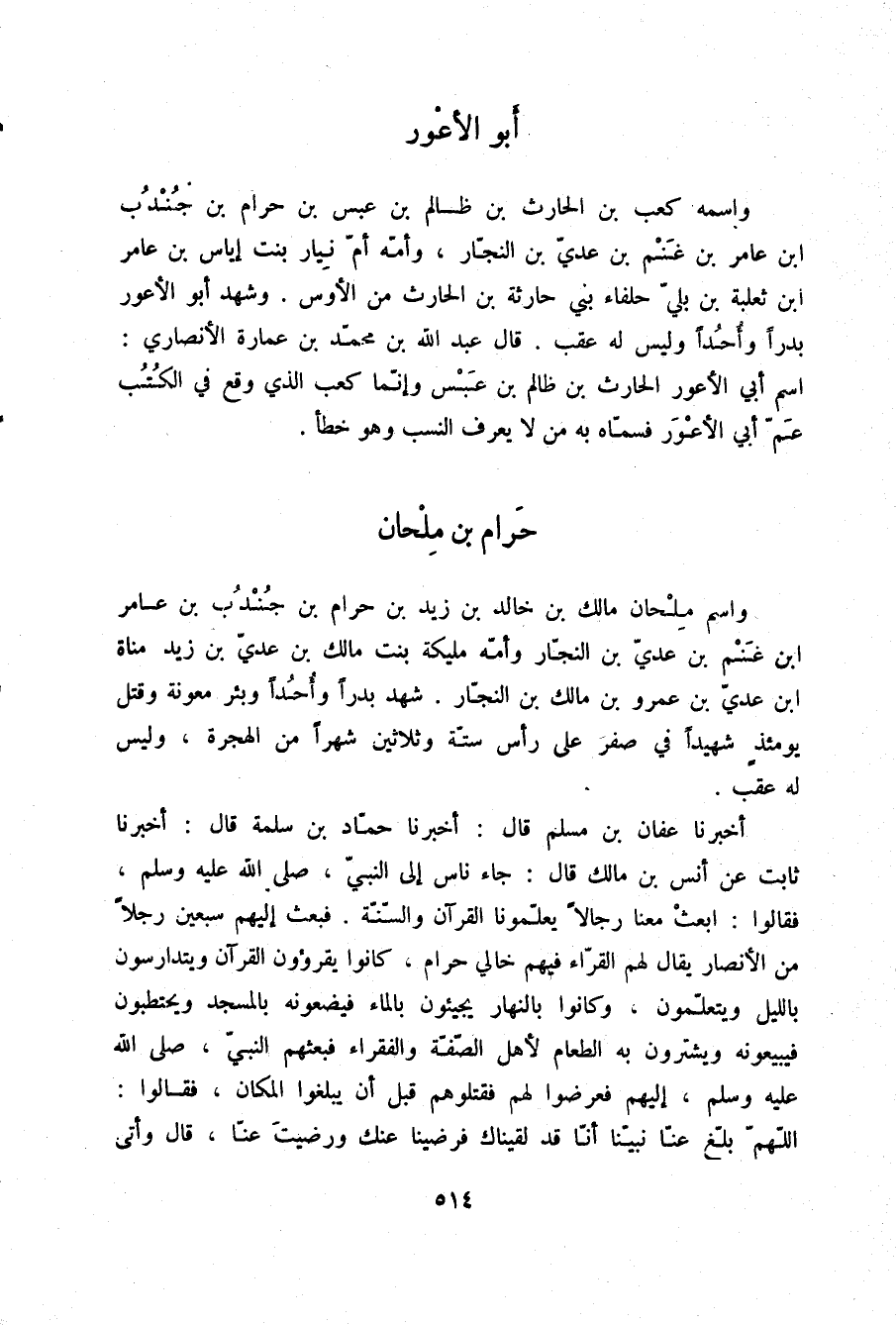 §حَرَامُ بْنُ مِلْحَانَ وَاسْمُ مِلْحَانَ مَالِكُ بْنُ خَالِدِ بْنِ زَيْدِ بْنِ حَرَامِ بْنِ جُنْدُبِ بْنِ عَامِرِ بْنِ غَنْمِ بْنِ عَدِيِّ بْنِ النَّجَّارِ، وَأُمُّهُ مُلَيْكَةُ بِنْتُ مَالِكِ بْنِ عَدِيِّ بْنِ زَيْدِ مَنَاةَ بْنِ عَدِيِّ بْنِ عَمْرِو بْنِ مَالِكِ بْنِ النَّجَّارِ، شَهِدَ بَدْرًا، وَأُحُدًا، وَبِئْرَ مَعُونَةَ، وَقُتِلَ يَوْمَئِذٍ شَهِيدًا فِي صَفَرٍ عَلَى رَأْسِ سِتَّةٍ وَثَلَاثِينَ شَهْرًا مِنَ الْهِجْرَةِ، وَلَيْسَ لَهُ عَقِبٌ.