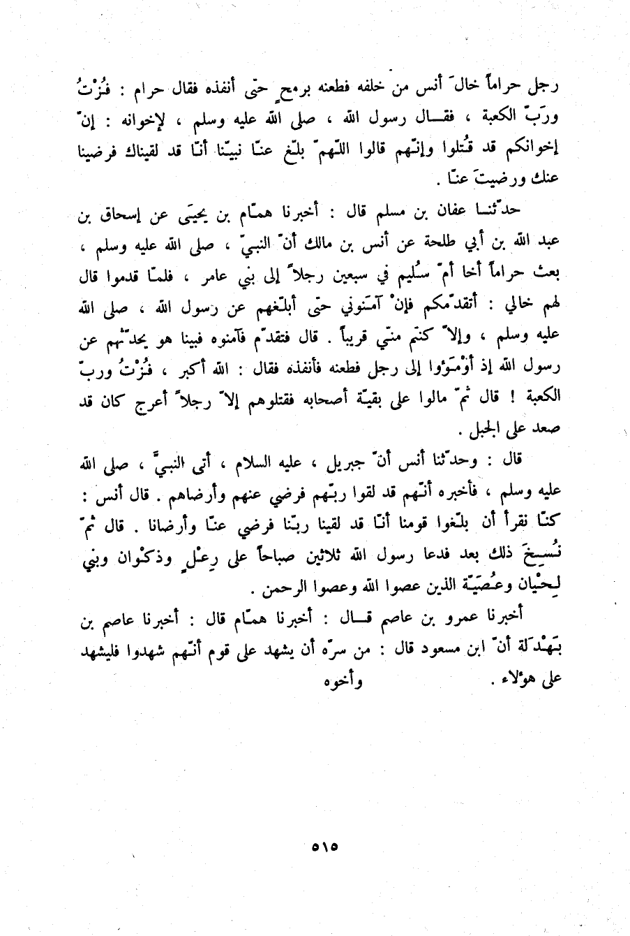 حَدَّثَنَا عَفَّانُ بْنُ مُسْلِمٍ قَالَ: أَخْبَرَنَا هَمَّامُ بْنُ يَحْيَى، عَنْ إِسْحَاقَ بْنِ عَبْدِ اللَّهِ بْنِ أَبِي طَلْحَةَ، عَنْ أَنَسِ بْنِ مَالِكٍ: " أَنَّ النَّبِيَّ صلّى الله عليه وسلم بَعَثَ حَرَامًا أَخَا أُمِّ سُلَيْمٍ فِي سَبْعِينَ رَجُلًا إِلَى بَنِي عَامِرٍ، فَلَمَّا قَدِمُوا قَالَ لَهُمْ خَالِي: " §أَتَقَدَّمُكُمْ، فَإِنْ آمَنُونِي حَتَّى أُبَلِّغَهُمْ عَنْ رَسُولِ اللَّهِ صلّى الله عليه وسلم وَإِلَّا كُنْتُمْ مِنِّي قَرِيبًا، قَالَ: فَتَقَدَّمَ، فَآمَنُوهُ، فَبَيْنَا هُوَ يُحَدِّثُهُمْ عَنْ رَسُولِ اللَّهِ إِذْ أَوْمَؤُوا إِلَى رَجُلٍ فَطَعَنَهُ فَأَنْفَذَهُ، فَقَالَ: «اللَّهُ أَكْبَرُ، فُزْتُ وَرَبِّ الْكَعْبَةِ» ، قَالَ: ثُمَّ مَالُوا عَلَى بَقِيَّةِ أَصْحَابِهِ فَقَتَلُوهُمْ، إِلَّا رَجُلًا أَعْرَجَ كَانَ قَدْ صَعِدَ عَلَى الْجَبَلِ ". قَالَ: وَحَدَّثَنَا أَنَسٌ أَنَّ جِبْرِيلَ عَلَيْهِ السَّلَامُ أَتَى النَّبِيَّ صلّى الله عليه وسلم فَأَخْبَرَهُ أَنَّهُمْ قَدْ لَقُوا رَبَّهُمْ فَرَضِيَ عَنْهُمْ وَأَرْضَاهُمْ، قَالَ أَنَسٌ: كُنَّا نَقْرَأُ: أَنْ بَلِّغُوا قَوْمَنَا أَنَّا قَدْ لَقِينَا رَبَّنَا فَرَضِيَ عَنَّا وَأَرْضَانَا، قَالَ: ثُمَّ نُسِخَ ذَلِكَ بَعْدُ، فَدَعَا رَسُولُ اللَّهِ ثَلَاثِينَ صَبَاحًا عَلَى رِعْلٍ وَذَكْوَانَ وَبَنِي لِحْيَانَ وَعُصَيَّةَ الَّذِينَ عَصَوُا اللَّهَ وَعَصَوُا الرَّحْمَنَ "