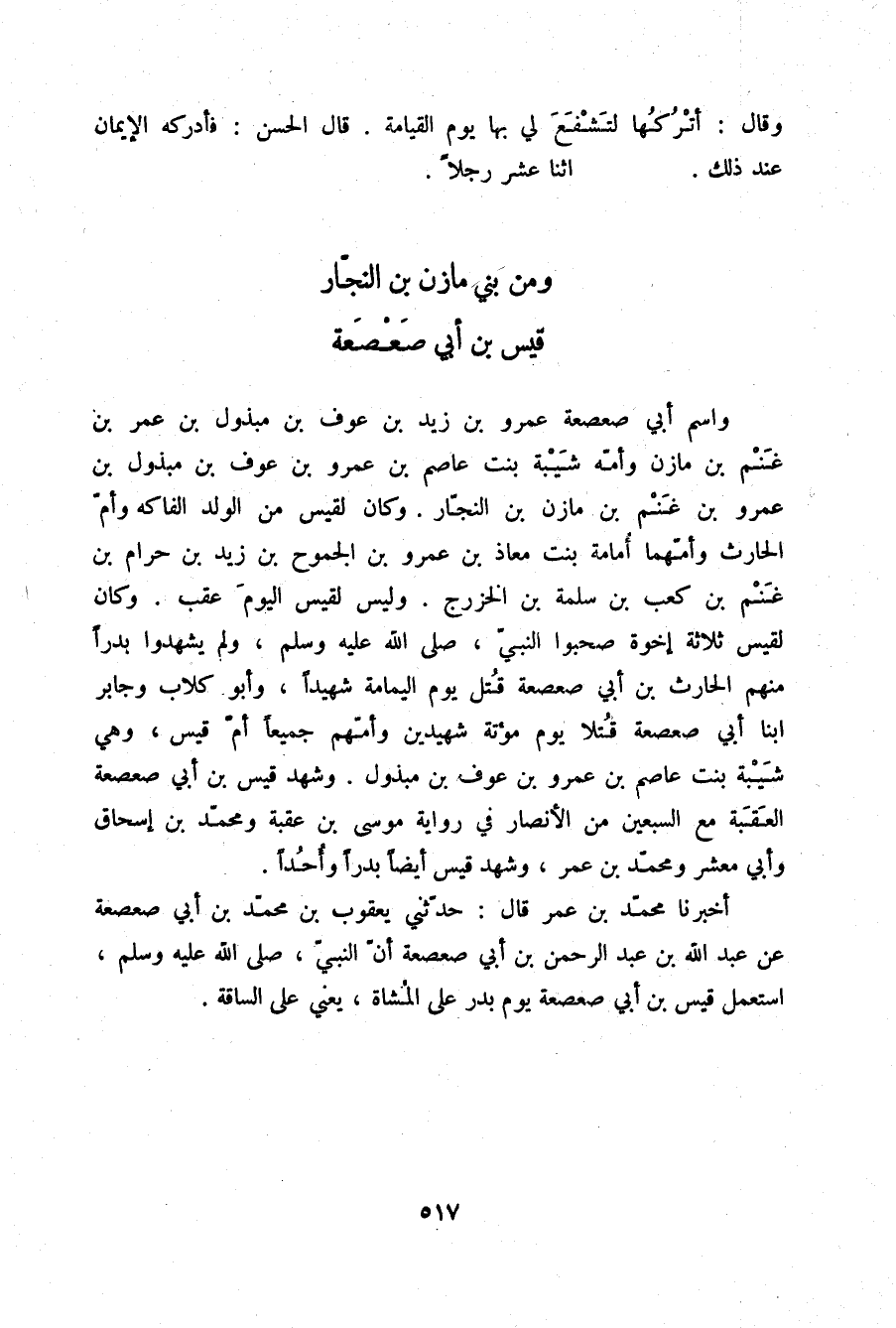 أَخْبَرَنَا مُحَمَّدُ بْنُ عُمَرَ قَالَ: حَدَّثَنِي يَعْقُوبُ بْنُ مُحَمَّدِ بْنِ أَبِي صَعْصَعَةَ، عَنْ عَبْدِ اللَّهِ بْنِ عَبْدِ الرَّحْمَنِ بْنِ أَبِي صَعْصَعَةَ: «§أَنَّ النَّبِيَّ صلّى الله عليه وسلم اسْتَعْمَلَ قَيْسَ بْنَ أَبِي صَعْصَعَةَ يَوْمَ بَدْرٍ عَلَى الْمُشَاةِ، يَعْنِي عَلَى السَّاقَةِ»
