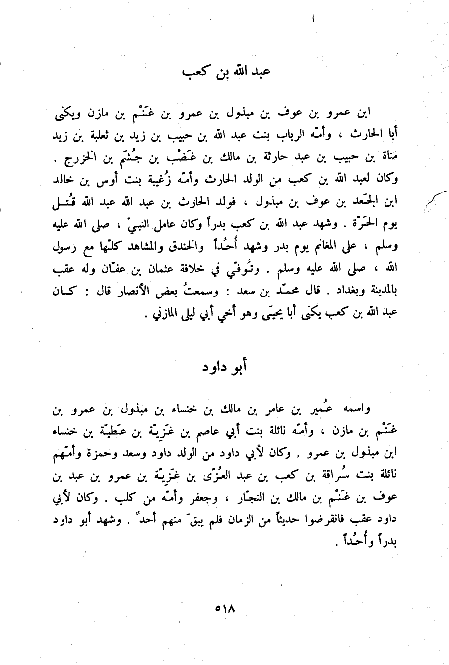§عَبْدُ اللَّهِ بْنُ كَعْبِ بْنِ عَمْرِو بْنِ عَوْفِ بْنِ مَبْذُولِ بْنِ عَمْرِو بْنِ غَنْمِ بْنِ مَازِنٍ وَيُكْنَى أَبَا الْحَارِثِ وَأُمُّهُ الْرََّبَابُ بِنْتُ عَبْدِ اللَّهِ بْنِ حَبِيبِ بْنِ زَيْدِ بْنِ ثَعْلَبَةَ بْنِ زَيْدِ مَنَاةَ بْنِ حَبِيبِ بْنِ عَبْدِ حَارِثَةَ بْنِ مَالِكِ بْنِ غَضْبِ بْنِ جُشَمَ بْنِ الْخَزْرَجِ، وَكَانَ لِعَبْدِ اللَّهِ بْنِ كَعْبٍ مِنَ الْوَلَدِ الْحَارِثُ وَأُمُّهُ زُغَيْبَةُ بِنْتُ أَوْسِ بْنِ خَالِدِ بْنِ الْجَعْدِ بْنِ عَوْفِ بْنِ مَبْذُولٍ، فَوَلَدُ الْحَارِثِ بْنِ عَبْدِ اللَّهِ: عَبْدُ اللَّهِ قُتِلَ يَوْمَ الْحَرَّةِ، وَشَهِدَ عَبْدُ اللَّهِ بْنُ كَعْبٍ بَدْرًا وَكَانَ عَامَلَ النَّبِيِّ صلّى الله عليه وسلم عَلَى الْمَغَانِمِ يَوْمَ بَدْرٍ، وَشَهِدَ أُحُدًا، وَالْخَنْدَقَ، وَالْمَشَاهِدَ كُلَّهَا مَعَ رَسُولِ اللَّهِ صلّى الله عليه وسلم، وَتُوُفِّيَ فِي خِلَافَةِ عُثْمَانَ بْنِ عَفَّانَ، وَلَهُ عَقِبٌ بِالْمَدِينَةِ وَبَغْدَادَ. قَالَ مُحَمَّدُ بْنُ سَعْدٍ: وَسَمِعْتُ بَعْضَ الْأَنْصَارِ قَالَ: كَانَ عَبْدُ اللَّهِ بْنُ كَعْبٍ يُكْنَى أَبَا يَحْيَى، وَهُوَ أَخُو أَبِي لَيْلَى الْمَازِنِيِّ أَبُو دَاوُدَ وَاسْمُهُ عُمَيْرُ بْنُ عَامِرِ بْنِ مَالِكِ بْنِ خَنْسَاءَ بْنِ مَبْذُولِ بْنِ عَمْرِو بْنِ غَنْمِ بْنِ مَازِنٍ، وَأُمُّهُ نَائِلَةُ بِنْتُ أَبِي عَاصِمِ بْنِ غَزِيَّةَ بْنِ عَطِيَّةَ بْنِ خَنْسَاءَ بْنِ مَبْذُولِ بْنِ عَمْرٍو، وَكَانَ لِأَبِي دَاوُدَ مِنَ الْوَلَدِ دَاوُدُ، وَسَعْدٌ، وَحَمْزَةُ، وَأُمُّهُمْ نَائِلَةُ بِنْتُ سُرَاقَةَ بْنِ كَعْبِ بْنِ عَبْدِ الْعُزَّى بْنِ غَزِيَّةَ بْنِ عَمْرِو بْنِ عَبْدِ بْنِ عَوْفِ بْنِ غَنْمِ بْنِ مَالِكِ بْنِ النَّجَّارِ، وَجَعْفَرٌ وَأُمُّهُ مِنْ كَلْبٍ، وَكَانَ لِأَبِي دَاوُدَ عَقِبٌ فَانْقَرَضُوا حَدِيثًا مِنَ الزَّمَانِ فَلَمْ يَبْقَ مِنْهُمْ أَحَدٌ، وَشَهِدَ أَبُو دَاوُدَ بَدْرًا، وَأُحُدًا.