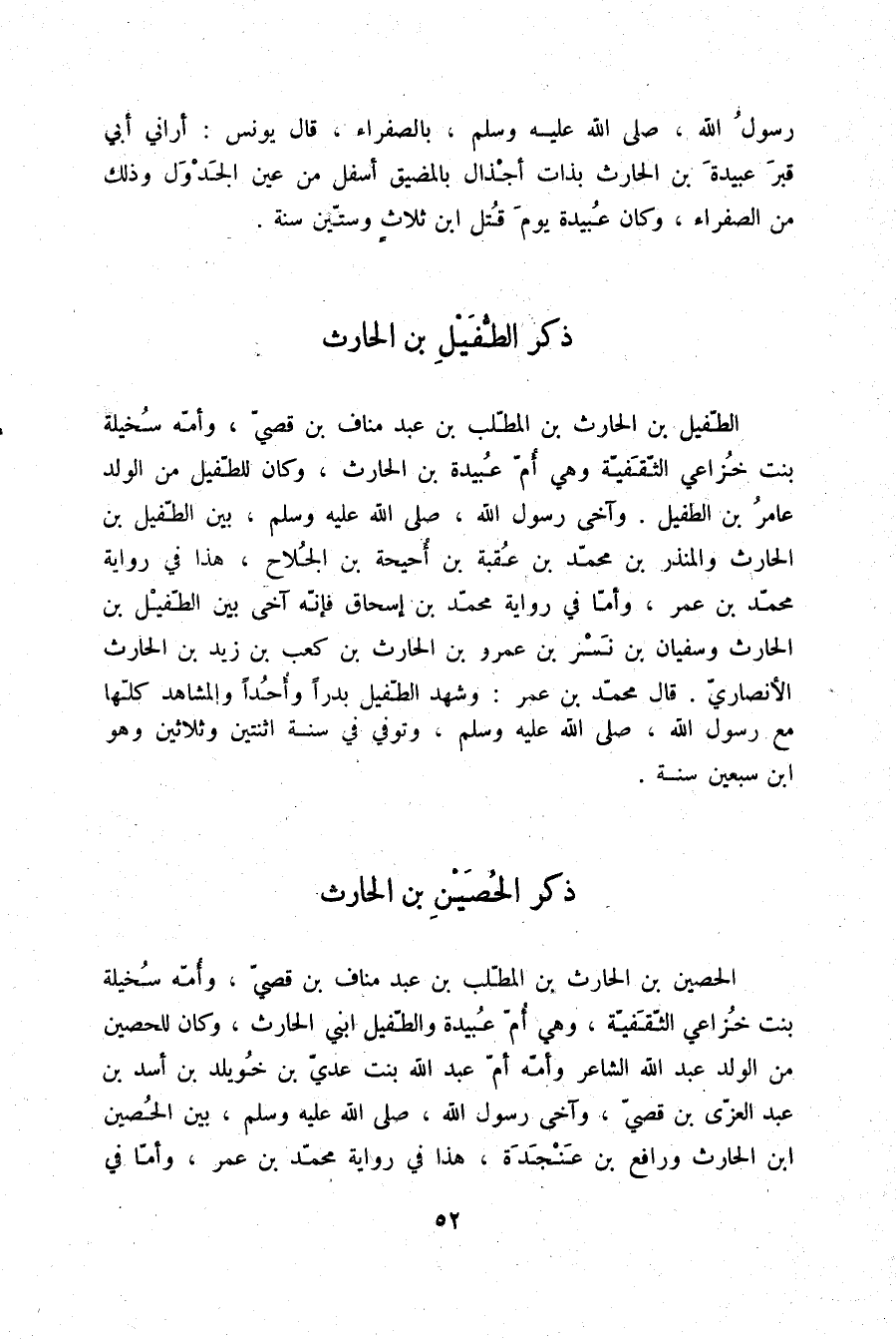 §ذِكْرُ الطُّفَيْلِ بْنِ الْحَارِثِ الطُّفَيْلُ بْنُ الْحَارِثِ بْنِ الْمُطَّلِبِ بْنِ عَبْدِ مَنَافِ بْنِ قُصَيٍّ , وَأُمُّهُ سُخَيْلَةُ بِنْتُ خُزَاعِيٍّ الثَّقَفِيَّةُ وَهِيَ أُمُّ عُبَيْدَةَ بْنِ الْحَارِثِ وَكَانَ لِلطُّفَيْلِ مِنَ الْوَلَدِ: عَامِرُ بْنُ الطُّفَيْلِ , وآخَى رَسُولُ اللَّهِ صلّى الله عليه وسلم بَيْنَ الطُّفَيْلِ بْنِ الْحَارِثِ وَالْمُنْذِرِ بْنِ مُحَمَّدِ بْنِ عُقْبَةَ بْنِ أُحَيْحَةَ بْنِ الْجُلَاحِ , هَذَا فِي رِوَايَةِ مُحَمَّدِ بْنِ عُمَرَ , وَأَمَّا فِي رِوَايَةِ مُحَمَّدِ بْنِ إِسْحَاقَ فَإِنَّهُ آخَى بَيْنَ الطُّفَيْلِ بْنِ الْحَارِثِ وَسُفْيَانِ بْنِ نَسْرِ بْنِ عَمْرِو بْنِ الْحَارِثِ بْنِ كَعْبِ بْنِ زَيْدِ بْنِ الْحَارِثِ الْأَنْصَارِيِّ. قَالَ مُحَمَّدُ بْنُ عُمَرَ: وَشَهِدَ الطُّفَيْلُ بَدْرًا، وَأُحُدًا وَالْمَشَاهِدَ كُلَّهَا مَعَ رَسُولِ اللَّهِ صلّى الله عليه وسلم، وَتُوُفِّيَ فِي سَنَةِ اثْنَتَيْنِ وَثَلَاثِينَ وَهُوَ ابْنُ سَبْعِينَ سَنَةً.