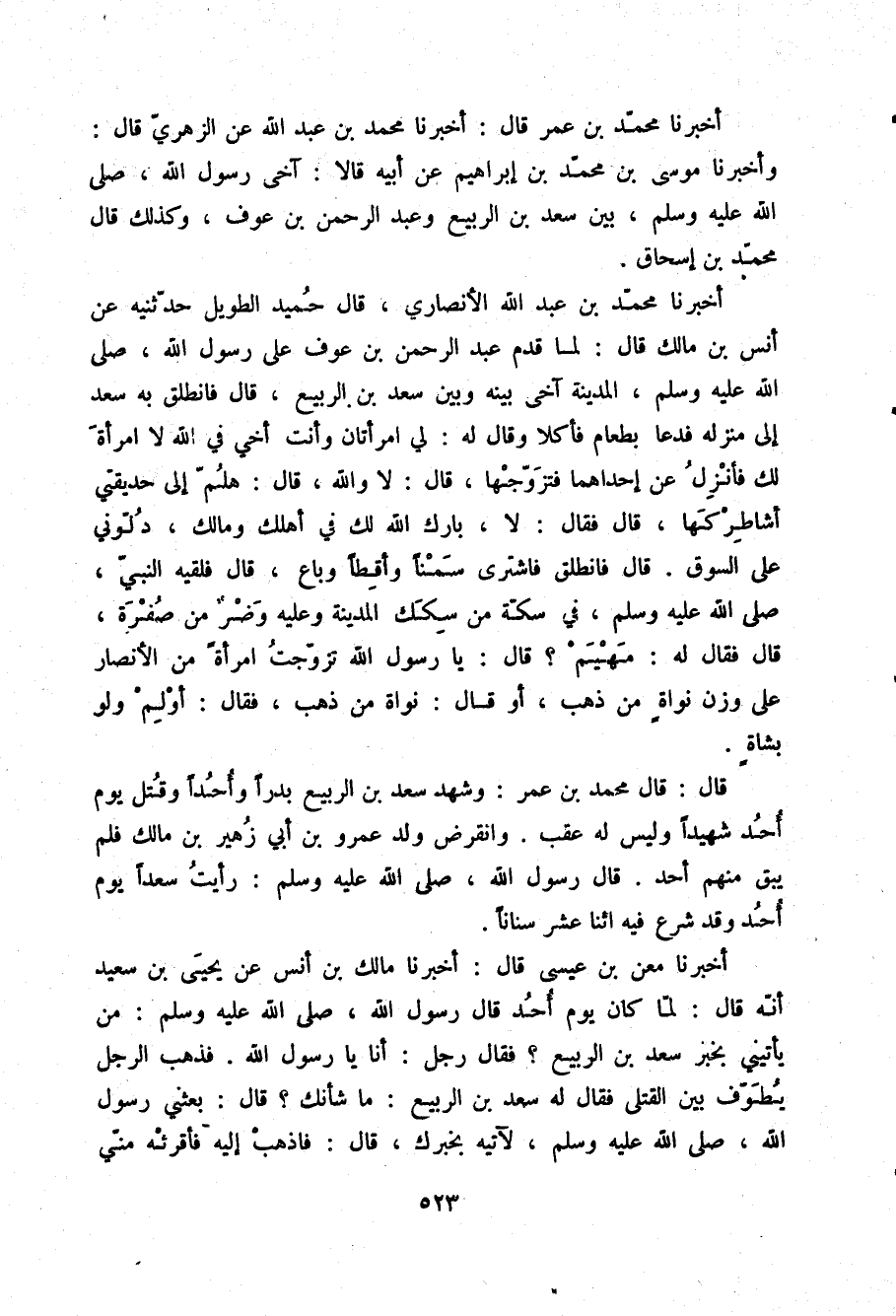 أَخْبَرَنَا مُحَمَّدُ بْنُ عَبْدِ اللَّهِ الْأَنْصَارِيُّ، قَالَ حُمَيْدٌ الطَّوِيلُ: حَدَّثَنِيهِ عَنْ أَنَسِ بْنِ مَالِكٍ قَالَ: " لَمَّا قَدِمَ عَبْدُ الرَّحْمَنِ بْنُ عَوْفٍ عَلَى رَسُولِ اللَّهِ صلّى الله عليه وسلم الْمَدِينَةَ آخَى بَيْنَهُ وَبَيْنَ سَعْدِ بْنِ الرَّبِيعِ، قَالَ: فَانْطَلَقَ بِهِ سَعْدٌ إِلَى مَنْزِلِهِ فَدَعَا بِطَعَامٍ فَأَكَلَا وَقَالَ لَهُ: لِيَ امْرَأَتَانِ، وَأَنْتَ أَخِي فِي اللَّهِ لَا امْرَأَةَ لَكَ، فَأَنْزِلُ عَنْ إِحْدَاهُمَا فَتَزَوَّجَهَا، قَالَ: لَا وَاللَّهِ، قَالَ: هَلُمَّ إِلَى حَدِيقَتِي أُشَاطِرْكَهَا، قَالَ: فَقَالَ: لَا، بَارَكَ اللَّهُ لَكَ فِي أَهْلِكِ وَمَالِكَ، دُلُّونِي عَلَى السُّوقِ، قَالَ: فَانْطَلَقَ فَاشْتَرَى سَمْنًا وَأَقِطًا وَبَاعَ، قَالَ: فَلَقِيَهُ النَّبِيُّ صلّى الله عليه وسلم فِي سِكَّةٍ مِنْ سِكَكِ الْمَدِينَةِ وَعَلَيْهِ وَضَرٌ مِنْ صُفْرَةٍ، قَالَ: فَقَالَ لَهُ: «مَهْيَمْ؟» قَالَ: يَا رَسُولَ اللَّهِ، تَزَوَّجْتُ امْرَأَةً مِنَ الْأَنْصَارِ عَلَى وَزْنِ نَوَاةٍ مِنْ ذَهَبٍ، أَوْ قَالَ: نَوَاةٍ مِنْ ذَهَبٍ، فَقَالَ: «§أَوْلِمْ وَلَوْ بِشَاةٍ» قَالَ: قَالَ مُحَمَّدُ بْنُ عُمَرَ: وَشَهِدَ سَعْدُ بْنُ الرَّبِيعِ بَدْرًا، وَأُحُدًا وَقُتِلَ يَوْمَ أُحُدٍ شَهِيدًا وَلَيْسَ لَهُ عَقِبٌ، وَانْقَرَضَ وَلَدُ عَمْرِو بْنِ أَبِي زُهَيْرِ بْنِ مَالِكٍ فَلَمْ يَبْقَ مِنْهُمْ أَحَدٌ. قَالَ رَسُولُ اللَّهِ صلّى الله عليه وسلم: «رَأَيْتُ سَعْدًا يَوْمَ أُحُدٍ وَقَدْ شَرَعَ فِيهِ اثْنَا عَشَرَ سِنَانًا» .