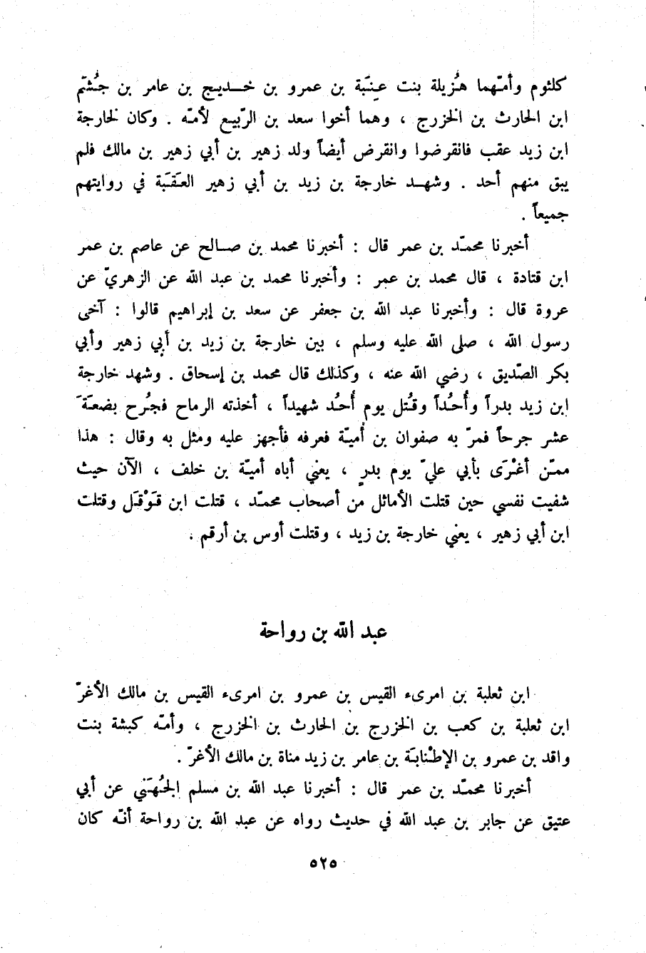 أَخْبَرَنَا مُحَمَّدُ بْنُ عُمَرَ قَالَ: أَخْبَرَنَا عَبْدُ اللَّهِ بْنُ مُسْلِمٍ الْجُهَنِيُّ، عَنْ أَبِي عَتِيقٍ، عَنْ جَابِرِ بْنِ عَبْدِ اللَّهِ، فِي حَدِيثٍ رَوَاهُ عَنْ §عَبْدِ اللَّهِ بْنِ رَوَاحَةَ: «أَنَّهُ كَانَ