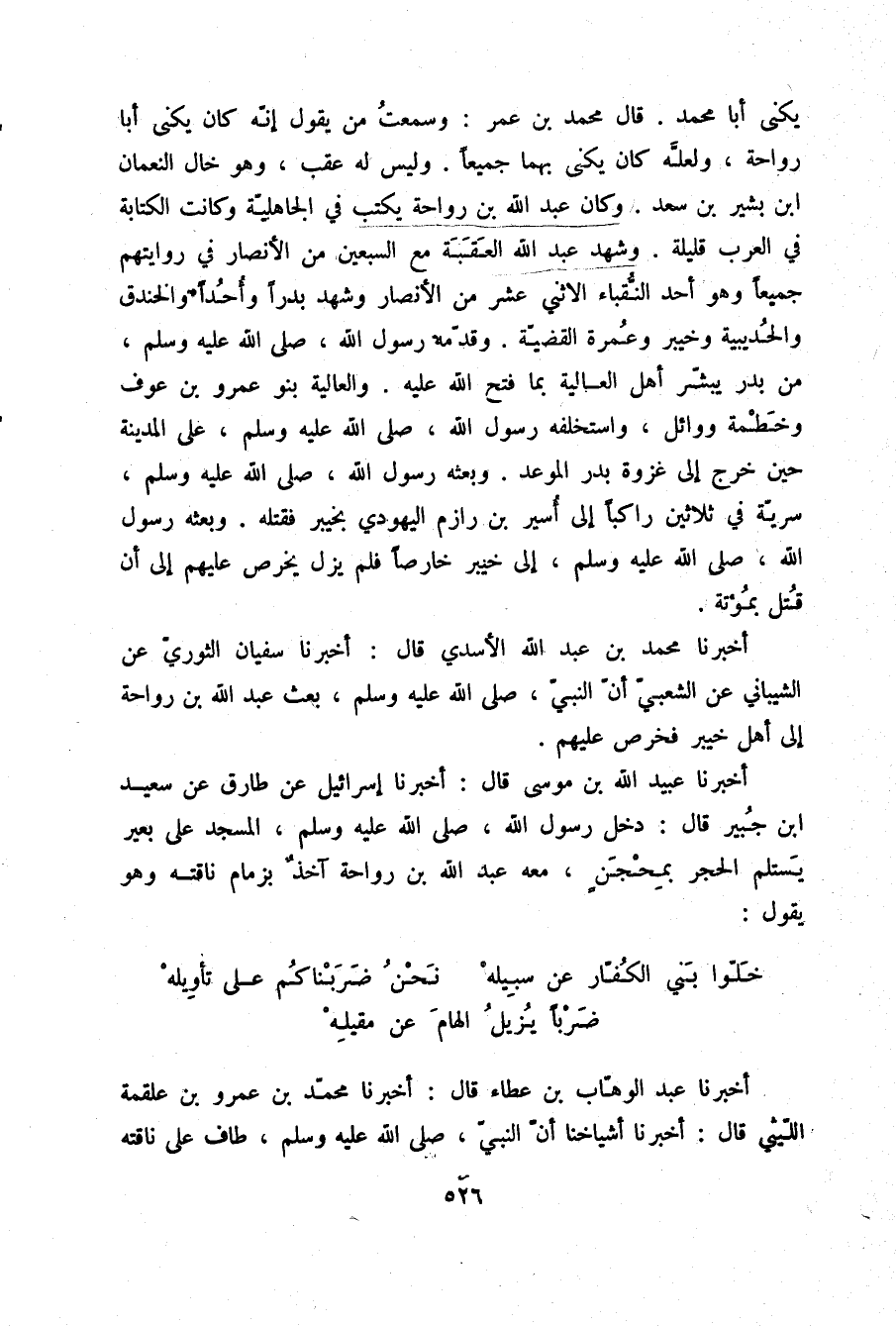 يُكْنَى أَبَا مُحَمَّدٍ» قَالَ مُحَمَّدُ بْنُ عُمَرَ: وَسَمِعْتُ مَنْ يَقُولُ: إِنَّهُ كَانَ يُكْنَى أَبَا رَوَاحَةَ، وَلَعَلَّهُ كَانَ يُكْنَى بِهِمَا جَمِيعًا، وَلَيْسَ لَهُ عَقِبٌ، وَهُوَ خَالُ النُّعْمَانِ بْنِ بَشِيرِ بْنِ سَعْدٍ، وَكَانَ عَبْدُ اللَّهِ بْنُ رَوَاحَةَ يَكْتُبُ فِي الْجَاهِلِيَّةِ وَكَانَتِ الْكِتَابَةُ فِي الْعَرَبِ قَلِيلَةٌ، وَشَهِدَ عَبْدُ اللَّهِ الْعَقَبَةَ مَعَ السَّبْعِينَ مِنَ الْأَنْصَارِ فِي رِوَايَتِهِمْ جَمِيعًا، وَهُوَ أَحَدُ النُّقَبَاءِ الِاثْنَيْ عَشَرَ مِنَ الْأَنْصَارِ، وَشَهِدَ بَدْرًا، وَأُحُدًا، وَالْخَنْدَقَ، وَالْحُدَيْبِيَةَ، وَخَيْبَرَ وَعُمْرَةَ الْقَضِيَّةِ، وَقَدَّمَهُ رَسُولُ اللَّهِ صلّى الله عليه وسلم مِنْ بَدْرٍ يُبَشِّرُ أَهْلَ الْعَالِيَةِ بِمَا فَتَحَ اللَّهُ عَلَيْهِ، وَالْعَالِيَةُ بَنُو عَمْرِو بْنِ عَوْفٍ، وَخَطْمَةَ، وَوَائِلٍ، وَاسْتَخْلَفَهُ رَسُولُ اللَّهِ صلّى الله عليه وسلم عَلَى الْمَدِينَةِ حِينَ خَرَجَ إِلَى غَزْوَةِ بَدْرٍ الْمَوْعِدِ، وَبَعَثَهُ رَسُولُ اللَّهِ صلّى الله عليه وسلم سَرِيَّةً فِي ثَلَاثِينَ رَاكِبًا إِلَى أُسَيْرِ بْنِ رِزَامٍ الْيَهُودِيِّ بِخَيْبَرَ فَقَتَلَهُ، وَبَعْثَهُ رَسُولُ اللَّهِ صلّى الله عليه وسلم إِلَى خَيْبَرَ خَارِصًا، فَلَمْ يَزَلْ يَخْرُصُ عَلَيْهِمْ إِلَى أَنْ قُتِلَ بِمُؤْتَةَ.