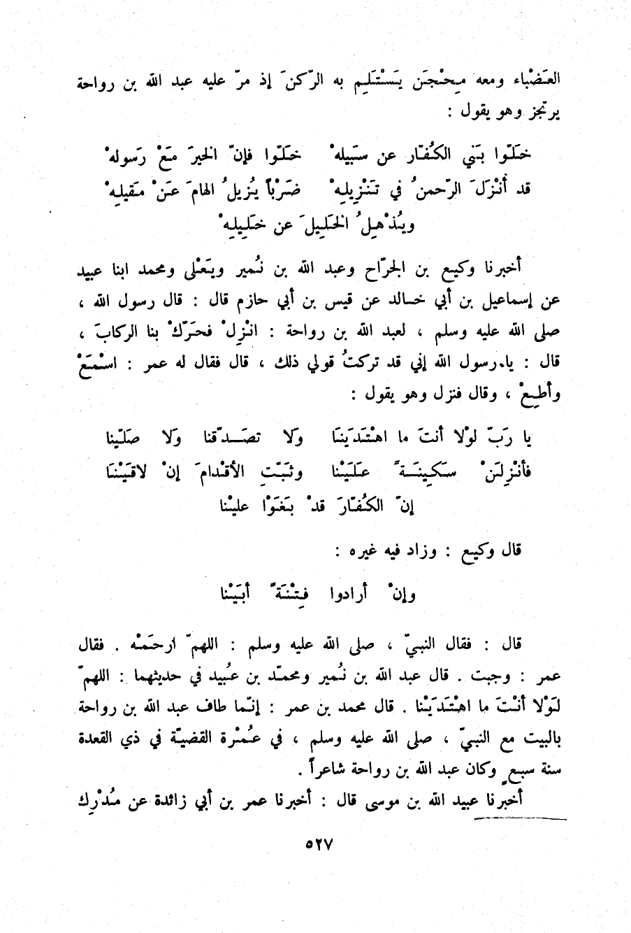اللَّهُمَّ لَوْلَا أَنْتَ مَا اهْتَدَيْنَا قَالَ مُحَمَّدُ بْنُ عُمَرَ: إِنَّمَا طَافَ عَبْدُ اللَّهِ بْنُ رَوَاحَةَ بِالْبَيْتِ مَعَ النَّبِيِّ صلّى الله عليه وسلم فِي عُمْرَةِ الْقَضِيَّةِ فِي ذِي الْقَعْدَةِ سَنَةَ سَبْعٍ، وَكَانَ عَبْدُ اللَّهِ بْنُ رَوَاحَةَ شَاعِرًا.
