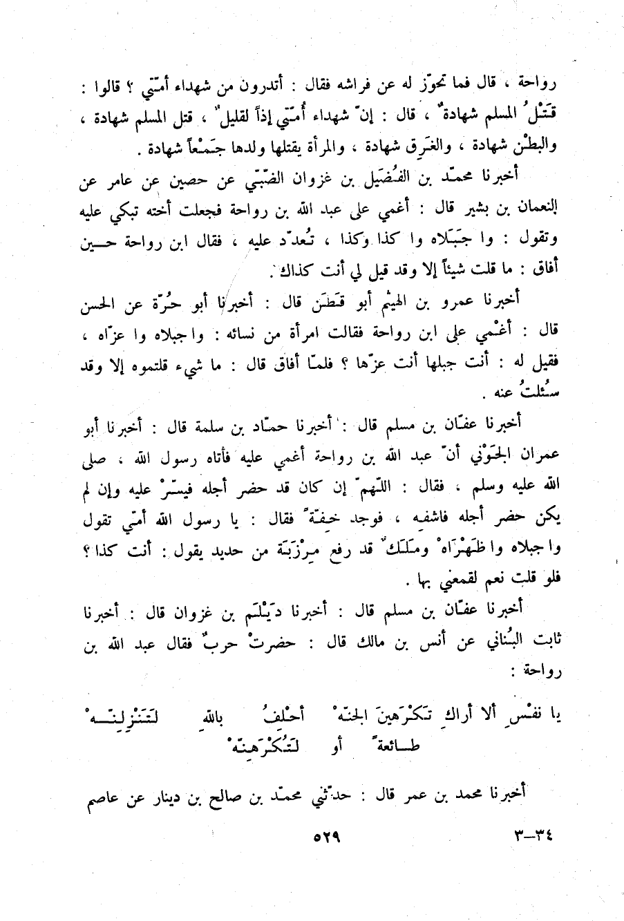 أَخْبَرَنَا عَمْرُو بْنُ الْهَيْثَمِ أَبُو قَطَنٍ قَالَ: أَخْبَرَنَا أَبُو حُرَّةَ، عَنِ الْحَسَنِ قَالَ: " أُغْمِيَ عَلَى ابْنِ رَوَاحَةَ، فَقَالَتِ امْرَأَةٌ مِنْ نِسَائِهِ: وَا جَبَلَاهُ، وَا عِزَّاهُ، فَقِيلَ لَهُ: أَنْتَ جَبَلُهَا، أَنْتَ عِزُّهَا، §فَلَمَّا أَفَاقَ قَالَ: «مَا شَيْءٌ قُلْتُمُوهُ إِلَّا وَقَدْ سُئِلْتُ عَنْهُ»