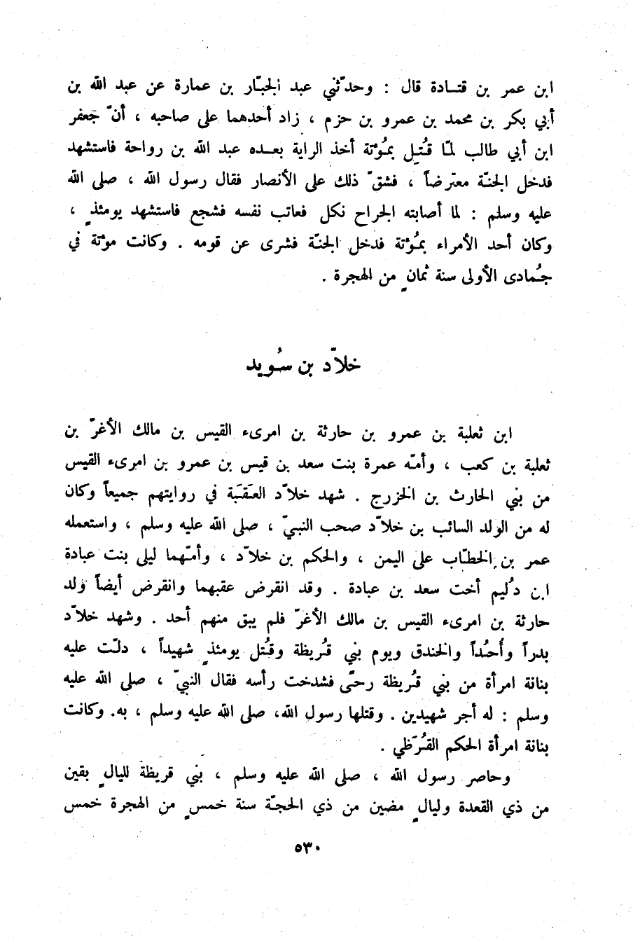 §خَلَّادُ بْنُ سُوَيْدِ بْنِ ثَعْلَبَةَ بْنِ عَمْرِو بْنِ حَارِثَةَ بْنِ امْرِئِ الْقَيْسِ بْنِ مَالِكِ الْأَغَرِّ بْنِ ثَعْلَبَةَ بْنِ كَعْبٍ وَأُمُّهُ عَمْرَةُ بِنْتُ سَعْدِ بْنِ قَيْسِ بْنِ عَمْرِو بْنِ امْرِئِ الْقَيْسِ مِنْ بَنِي الْحَارِثِ بْنِ الْخَزْرَجِ، شَهِدَ خَلَّادٌ الْعَقَبَةَ فِي رِوَايَتِهِمْ جَمِيعًا، وَكَانَ لَهُ مِنَ الْوَلَدِ السَّائِبُ بْنُ خَلَّادٍ، صَحِبَ النَّبِيَّ صلّى الله عليه وسلم وَاسْتَعْمَلَهُ عُمَرُ بْنُ الْخَطَّابِ عَلَى الْيَمَنِ، وَالْحَكَمُ بْنُ خَلَّادٍ، وَأُمُّهُمَا لَيْلَى بِنْتُ عُبَادَةَ بْنِ دُلَيْمٍ أُخْتِ سَعْدِ بْنِ عُبَادَةَ، وَقَدِ انْقَرَضَ عَقِبَهُمَا، وَانْقَرَضَ أَيْضًا وَلَدُ حَارِثَةَ بْنِ امْرِئِ الْقَيْسِ بْنِ مَالِكِ الْأَغَرِّ فَلَمْ يَبْقَ مِنْهُمْ أَحَدٌ، وَشَهِدَ خَلَّادٌ بَدْرًا، وَأُحُدًا، وَالْخَنْدَقَ، وَيَوْمَ بَنِي قُرَيْظَةَ، وَقُتِلَ يَوْمَئِذٍ شَهِيدًا، دَلَّتْ عَلَيْهِ بُنَانَةُ امْرَأَةٌ مِنْ بَنِي قُرَيْظَةَ رَحًى فَشَدَخَتْ رَأْسَهُ، فَقَالَ النَّبِيُّ صلّى الله عليه وسلم: «لَهُ أَجْرُ شَهِيدَيْنِ» ، وَقَتَلَهَا رَسُولُ اللَّهِ صلّى الله عليه وسلم بِهِ، وَكَانَتْ بُنَانَةُ امْرَأَةَ الْحَكَمِ الْقُرَظِيِّ، وَحَاصَرَ رَسُولُ اللَّهِ صلّى الله عليه وسلم بَنِي قُرَيْظَةَ لِلَيَالٍ بَقِينَ مِنْ ذِي الْقَعْدَةِ وَلَيَالٍ مَضَيْنَ مِنْ ذِي الْحِجَّةِ سَنَةَ خَمْسٍ مِنَ الْهِجْرَةِ خَمْسَ