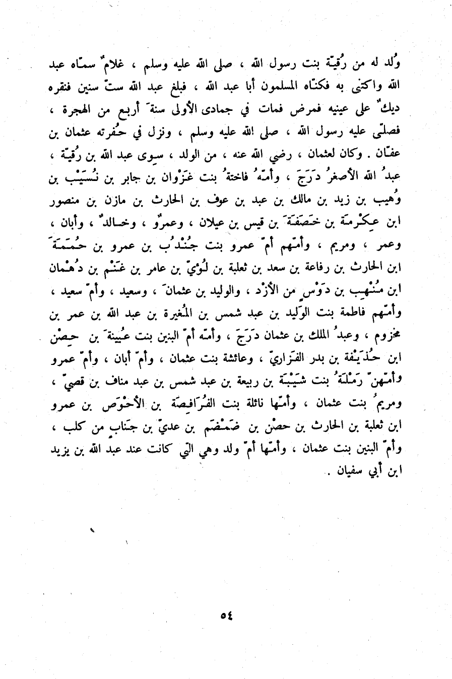 وُلِدَ لَهُ مِنْ رُقْيَةَ بِنْتِ رَسُولِ اللَّهِ صلّى الله عليه وسلم غُلَامٌ سَمَّاهُ: عَبْدُ اللَّهِ وَاكْتَنَى بِهِ فَكَنَّاهُ الْمُسْلِمُونَ أَبَا عَبْدِ اللَّهِ فَبَلَغَ عَبْدُ اللَّهِ سِتَّ سِنِينَ فَنَقَرَهُ دِيكٌ عَلَى عَيْنَيْهِ فَمَرِضَ فَمَاتَ فِي جُمَادَى الْأُولَى سَنَةَ أَرْبَعٍ مِنَ الْهِجْرَةِ، فَصَلَّى عَلَيْهِ رَسُولُ اللَّهِ صلّى الله عليه وسلم , وَنَزَلَ فِي حُفْرَتِهِ عُثْمَانُ بْنُ عَفَّانَ , وَكَانَ لِعُثْمَانَ رَضِيَ اللَّهُ عَنْهُ مِنَ الْوَلَدِ سِوَى عَبْدِ اللَّهِ ابْنِ رُقْيَةَ: عَبْدُ اللَّهِ الْأَصْغَرُ دَرَجَ , وَأُمُّهُ فَاخِتَةُ بِنْتُ غَزْوَانَ بْنِ جَابِرِ بْنِ نَسِيبِ بْنِ وُهَيْبِ بْنِ زَيْدِ بْنِ مَالِكِ بْنِ عَبْدِ بْنِ عَوْفِ بْنِ الْحَارِثِ بْنِ مَازِنِ بْنِ مَنْصُورِ بْنِ عِكْرِمَةَ بْنِ خَصَفَةَ بْنِ قَيْسِ بْنِ عَيْلَانَ , وَعَمْرٌو , وَخَالِدٌ , وَأَبَانُ , وَعُمَرُ , وَمَرْيَمُ , وَأُمُّهُمْ أُمُّ عَمْرٍو بِنْتُ جُنْدُبِ بْنِ عَمْرِو بْنِ حُمَمَةَ بْنِ الْحَارِثِ بْنِ رِفَاعَةَ بْنِ سَعْدِ بْنِ ثَعْلَبَةَ بْنِ لُؤَيِّ بْنِ عَامِرِ بْنِ غَنْمِ بْنِ دُهْمَانَ بْنِ مُنْهِبِ بْنِ دَوْسٍ مِنَ الْأَزْدِ , وَالْوَلِيدُ بْنُ عُثْمَانَ , وَسَعِيدٌ , وَأُمُّ سَعِيدٍ , وَأُمُّهُمْ فَاطِمَةُ بِنْتُ الْوَلِيدِ بْنِ عَبْدِ شَمْسِ بْنِ الْمُغِيرَةِ بْنِ عَبْدِ اللَّهِ بْنِ عُمَرَ بْنِ مَخْزُومٍ , وَعَبْدُ الْمَلِكِ بْنُ عُثْمَانَ دَرَجَ، وَأُمُّهُ أُمُّ الْبَنِينَ بِنْتُ عُيَيْنَةَ بْنِ حِصْنِ بْنِ حُذَيْفَةَ بْنِ بَدْرٍ الْفَزَارِيُّ , وَعَائِشَةُ بِنْتُ عُثْمَانَ , وَأُمُّ أَبَانَ , وَأُمُّ عَمْرٍو، وَأُمُّهُنَّ رَمْلَةُ بِنْتُ شَيْبَةَ بْنِ رَبِيعَةَ بْنِ عَبْدِ شَمْسِ بْنِ عَبْدِ مَنَافِ بْنِ قُصَيٍّ , وَمَرْيَمُ بِنْتُ عُثْمَانَ وَأُمُّهَا نَائِلَةُ بِنْتُ الْفُرَافِصَةِ بْنِ الْأَحْوَصِ بْنِ عَمْرِو بْنِ ثَعْلَبَةَ بْنِ الْحَارِثِ بْنِ حِصْنِ بْنِ ضَمْضَمِ بْنِ عَدِيِّ بْنِ جَنَابٍ مِنْ كَلْبٍ , وَأُمُّ الْبَنِينَ بِنْتُ عُثْمَانَ، وَأُمُّهَا أُمُّ وَلَدٍ، وَهِيَ الَّتِي كَانَتْ عِنْدَ عَبْدِ اللَّهِ بْنِ يَزِيدَ بْنِ أَبِي سُفْيَانَ