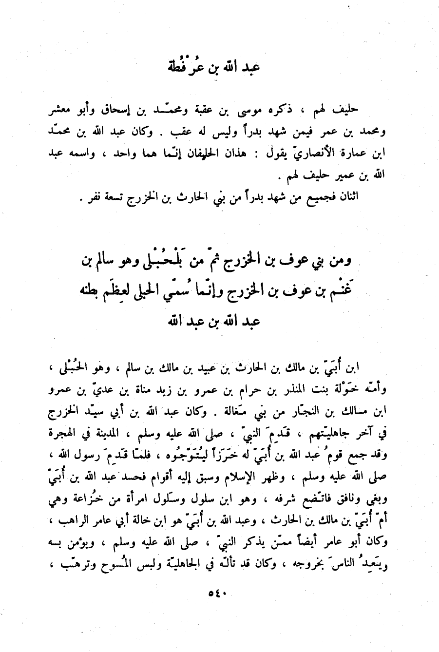 §عَبْدُ اللَّهِ بْنُ عَبْدِ اللَّهِ بْنِ أُبَيِّ بْنِ مَالِكِ بْنِ الْحَارِثِ بْنِ عُبَيْدِ بْنِ مَالِكِ بْنِ سَالِمِ وَهُوَ الْحُبْلَى، وَأُمُّهُ خَوْلَةُ بِنْتُ الْمُنْذِرِ بْنِ حَرَامِ بْنِ عَمْرِو بْنِ زَيْدِ مَنَاةَ بْنِ عَدِيِّ بْنِ عَمْرِو بْنِ مَالِكِ بْنِ النَّجَّارِ مِنْ بَنِي مَغَالَةَ، وَكَانَ عَبْدُ اللَّهِ بْنُ أُبَيٍّ سَيِّدٍ الْخَزْرَجِ وَفِي آخِرِ جَاهِلِيَّتِهِمْ، قَدِمَ النَّبِيُّ صلّى الله عليه وسلم الْمَدِينَةَ فِي الْهِجْرَةِ وَقَدْ جَمَعَ قَوْمُ عَبْدِ اللَّهِ بْنِ أُبَيٍّ لَهُ خَرَزًا لِيُتَوِّجُوهُ، فَلَمَّا قَدِمَ رَسُولُ اللَّهِ صلّى الله عليه وسلم وَظَهَرَ الْإِسْلَامُ وَسَبَقَ إِلَيْهِ أَقْوَامٌ فَحَسَدَ عَبْدُ اللَّهِ بْنُ أُبَيٍّ وَبَغَى وَنَافَقَ فَاتَّضَعَ شَرَفُهُ، وَهُوَ ابْنُ سَلُولَ، وَسَلُولُ امْرَأَةٌ مِنْ خُزَاعَةَ وَهِيَ أُمُّ أُبَيِّ بْنِ مَالِكِ بْنِ الْحَارِثِ، وَعَبْدُ اللَّهِ بْنُ أُبِيٍّ هُوَ ابْنُ خَالَةِ أَبِي عَامِرٍ الرَّاهِبِ، وَكَانَ أَبُو عَامِرٍ أَيْضًا مِمَّنْ يَذْكُرُ النَّبِيَّ صلّى الله عليه وسلم وَيُؤْمَنُ بِهِ وَيَعِدُ النَّاسَ بِخُرُوجِهِ، وَكَانَ قَدْ تَأَلَّهَ فِي الْجَاهِلِيَّةِ وَلَبِسَ الْمُسُوحَ وَتَرَهَّبَ