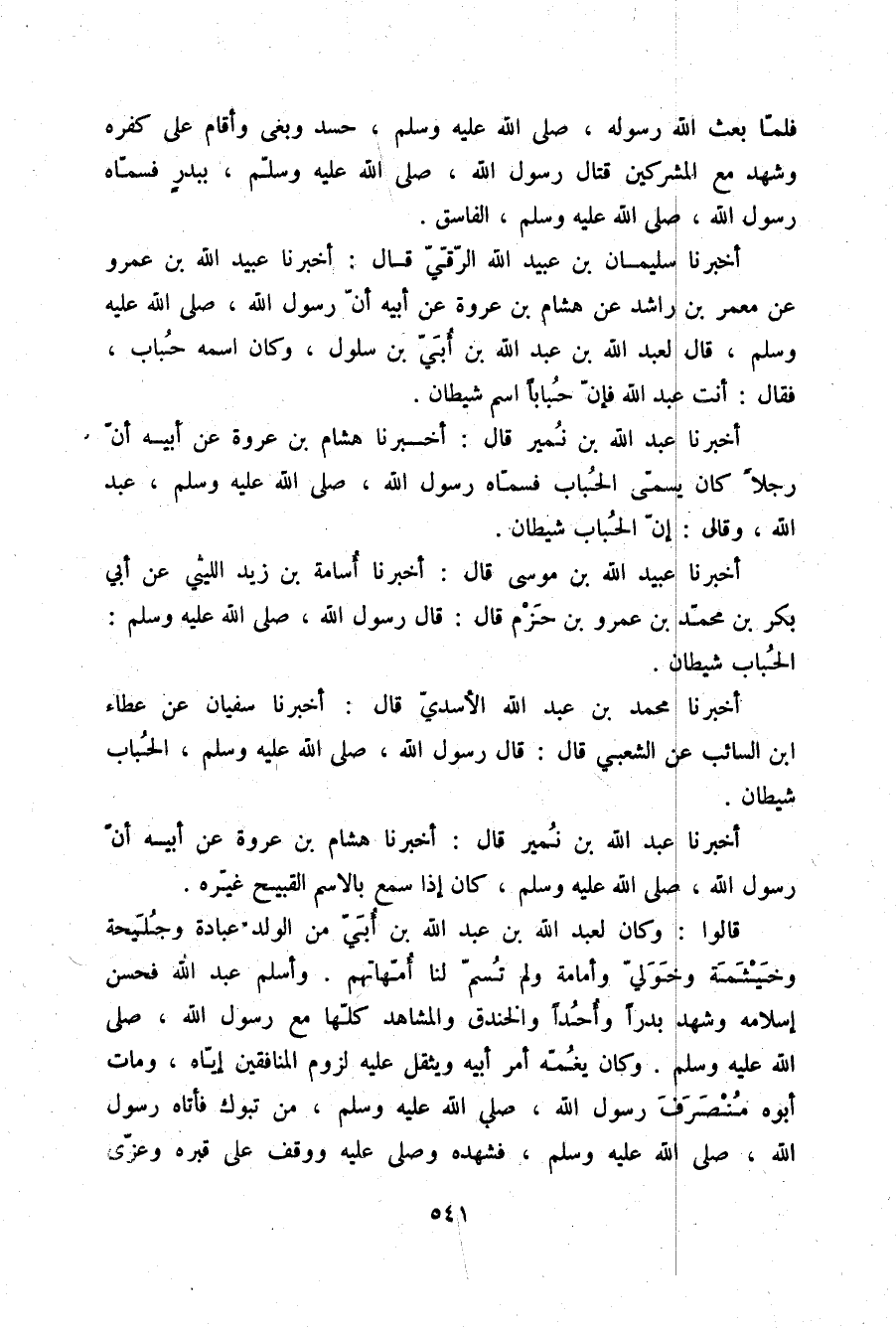 أَخْبَرَنَا سُلَيْمَانُ بْنُ عُبَيْدِ اللَّهِ الرَّقِّيُّ قَالَ: أَخْبَرَنَا عُبَيْدُ اللَّهِ بْنُ عَمْرٍو، عَنْ مَعْمَرِ بْنِ رَاشِدٍ، عَنْ هِشَامِ بْنِ عُرْوَةَ، عَنْ أَبِيهِ: " أَنَّ رَسُولَ اللَّهِ صلّى الله عليه وسلم قَالَ لِعَبْدِ اللَّهِ بْنِ عَبْدِ الْلَّهِ بْنِ أُبَيٍّ ابْنِ سَلُولَ، وَكَانَ اسْمُهُ حُبَابٌ، فَقَالَ: «§أَنْتَ عَبْدُ اللَّهِ، فَإِنُّ حُبَابًا اسْمُ شَيْطَانَ»