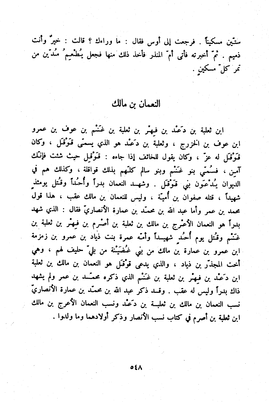 §النُّعْمَانُ بْنُ مَالِكِ بْنِ ثَعْلَبَةَ بْنِ دَعْدِ بْنِ فِهْرِ بْنِ ثَعْلَبَةَ بْنِ غَنْمِ بْنِ عَوْفِ بْنِ عَمْرِو بْنِ عَوْفِ بْنِ الْخَزْرَجِ وَثَعْلَبَةُ بْنُ دَعْدٍ هُوَ الَّذِي يُسَمَّى قَوْقَلٌ، وَكَانَ قَوْقَلٌ لَهُ عِزٌّ، وَكَانَ يَقُولُ لِلْخَائِفِ إِذَا جَاءَهُ: قَوْقِلْ حَيْثُ شِئْتَ فَإِنَّكَ آمِنٌ، فَسُمِّيَ بَنُو غَنْمٍ وَبَنُو سَالِمٍ كُلُّهُمْ بِذَلِكَ قَوَاقِلَةً، وَكَذَلِكَ هُمْ فِي الدِّيوَانِ يُدْعَوْنَ بَنِي قَوْقَلٍ، وَشَهِدَ النُّعْمَانُ بَدْرًا، وَأُحُدًا، وَقُتِلَ يَوْمَئِذٍ شَهِيدًا، قَتَلَهُ صَفْوَانُ بْنُ أُمَيَّةَ، وَلَيْسَ لِلنُّعْمَانِ بْنِ مَالِكٍ عَقِبٌ، هَذَا قَوْلُ مُحَمَّدِ بْنِ عُمَرَ، وَأَمَّا عَبْدُ اللَّهِ بْنُ مُحَمَّدِ بْنِ عُمَارَةَ الْأَنْصَارِيُّ فَقَالَ: الَّذِي شَهِدَ بَدْرًا هُوَ النُّعْمَانُ الْأَعْرَجُ بْنُ مَالِكِ بْنِ ثَعْلَبَةَ بْنِ أَصْرَمَ بْنِ فِهْرِ بْنِ ثَعْلَبَةَ بْنِ غَنْمٍ، وَقُتِلَ يَوْمَ أُحُدٍ شَهِيدًا، وَأُمُّهُ عَمْرَةُ بِنْتُ ذِيَادِ بْنِ عَمْرِو بْنِ زَمْزَمَةَ بْنِ عَمْرِو بْنِ عُمَارَةَ بْنِ مَالِكٍ مِنْ بَنِي غُضَيْنَةَ مِنْ بَلِيٍّ حَلِيفٌ لَهُمْ وَهِيَ أُخْتُ الْمُجَذَّرِ بْنِ ذِيَادٍ، وَالَّذِي يُدْعَى قَوْقَلٌ هُوَ النُّعْمَانُ بْنُ مَالِكِ بْنِ ثَعْلَبَةَ بْنِ دَعْدِ بْنِ فِهْرِ بْنِ ثَعْلَبَةَ بْنِ غَنْمٍ الَّذِي ذَكَرَهُ مُحَمَّدُ بْنُ عُمَرَ، وَلَمْ يَشْهَدْ ذَاكَ بَدْرًا وَلَيْسَ لَهُ عَقِبٌ، وَقَدْ ذَكَرَ عَبْدُ اللَّهِ بْنُ مُحَمَّدِ بْنِ عُمَارَةَ الْأَنْصَارِيُّ نَسَبَ النُّعْمَانِ بْنِ مَالِكِ بْنِ ثَعْلَبَةَ بْنِ دَعْدٍ، وَنَسَبَ النُّعْمَانِ الْأَعْرَجِ بْنِ مَالِكِ بْنِ ثَعْلَبَةَ بْنِ أَصْرَمَ فِي كِتَابِ نَسَبِ الْأَنْصَارِ وَذَكَرَ أَوْلَادَهُمَا وَمَا وَلَدُوا.