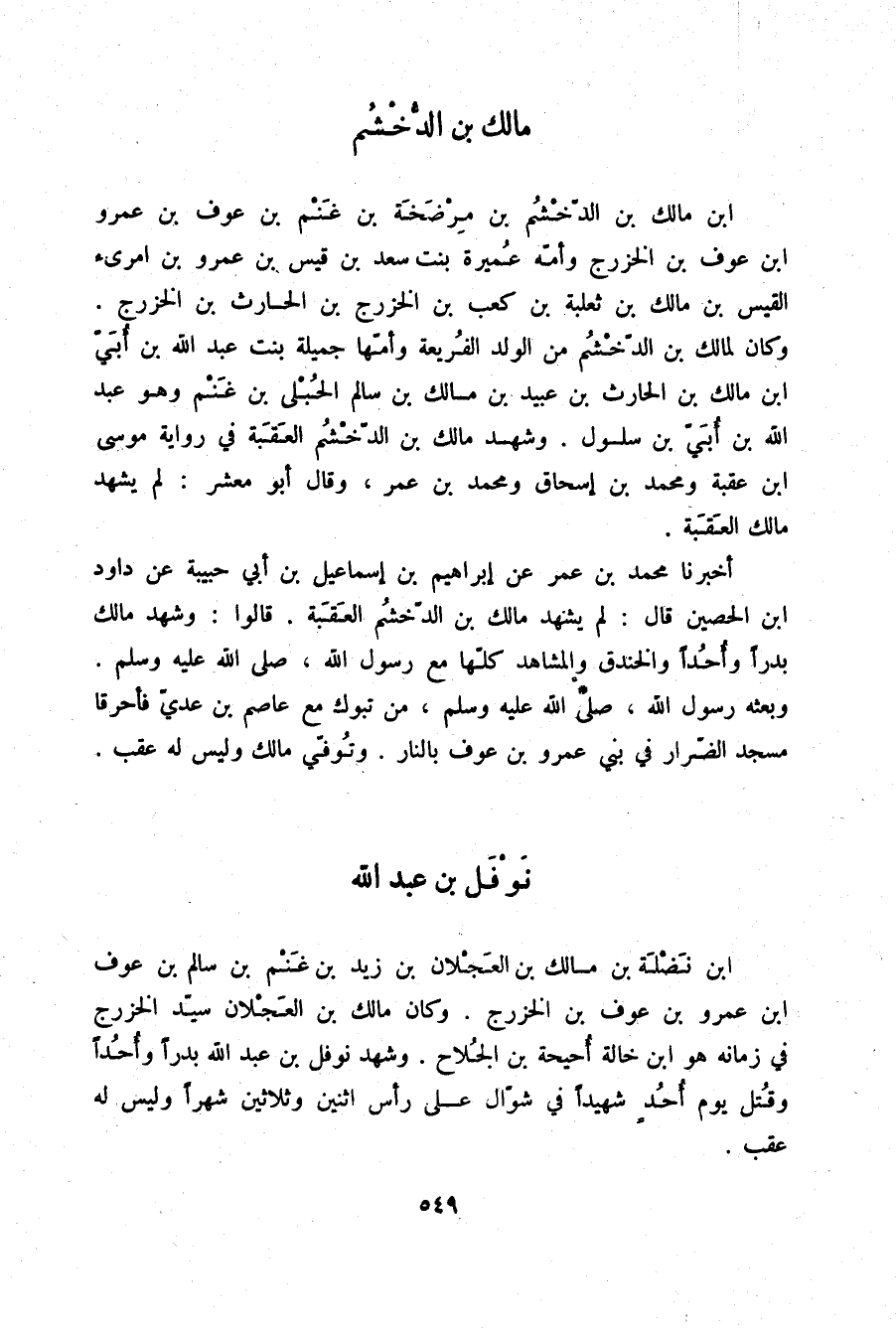 أَخْبَرَنَا مُحَمَّدُ بْنُ عُمَرَ، عَنْ إِبْرَاهِيمَ بْنِ إِسْمَاعِيلَ بْنِ أَبِي حَبِيبَةَ، عَنْ دَاوُدَ بْنِ الْحُصَيْنِ قَالَ: «§لَمْ يَشْهَدْ مَالِكُ بْنُ الدُّخْشُمِ الْعَقَبَةَ» قَالُوا: وَشَهِدَ مَالِكٌ بَدْرًا، وَأُحُدًا، وَالْخَنْدَقَ، وَالْمَشَاهِدَ كُلَّهَا مَعَ رَسُولِ اللَّهِ صلّى الله عليه وسلم وَبَعْثَهُ رَسُولُ اللَّهِ صلّى الله عليه وسلم مِنْ تَبُوكَ مَعَ عَاصِمِ بْنِ عَدِيٍّ فَأَحْرَقَا مَسْجِدَ الضِّرَارِ فِي بَنِي عَمْرِو بْنِ عَوْفٍ بِالنَّارِ، وَتُوُفِّيَ مَالِكٌ وَلَيْسَ لَهُ عَقِبٌ.