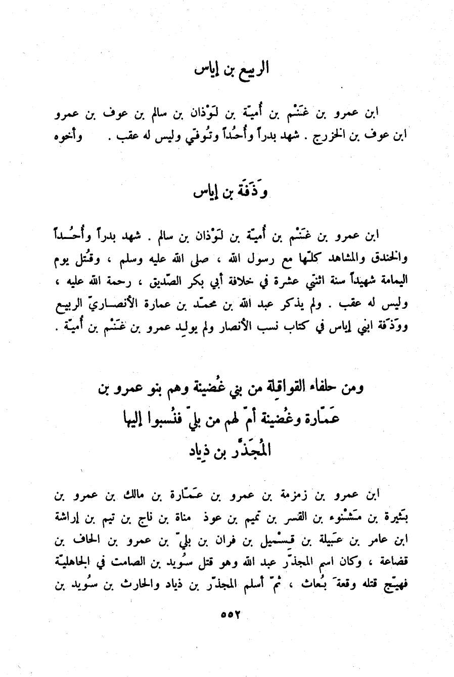 §وَأَخُوهُ وَذَفَةُ بْنُ إِيَاسِ بْنِ عَمْرِو بْنِ غَنْمِ بْنِ أُمَيَّةَ بْنِ لَوْذَانَ بْنِ سَالِمٍ شَهِدَ بَدْرًا، وَأُحُدًا، وَالْخَنْدَقَ، وَالْمَشَاهِدَ كُلَّهَا مَعَ رَسُولِ اللَّهِ صلّى الله عليه وسلم، وَقُتِلَ يَوْمَ الْيَمَامَةِ شَهِيدًا سَنَةَ اثْنَتَيْ عَشْرَةَ فِي خِلَافَةِ أَبِي بَكْرٍ الصِّدِّيقِ رَحْمَةُ اللَّهِ عَلَيْهِ، وَلَيْسَ لَهُ عَقِبٌ، وَلَمْ يَذْكُرْ عَبْدُ اللَّهِ بْنُ مُحَمَّدِ بْنِ عُمَارَةَ الْأَنْصَارِيُّ الرَّبِيعَ وَوَذَفَةَ ابْنَيْ إِيَاسَ فِي كِتَابِ نَسَبِ الْأَنْصَارِ، وَلَمْ يُولِدْ عَمْرَو بْنَ غَنْمِ بْنِ أُمَيَّةَ.