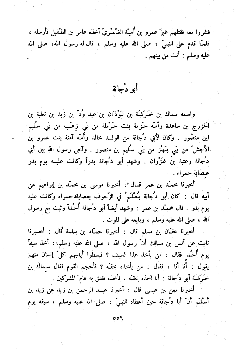 أَخْبَرَنَا عَفَّانُ بْنُ مُسْلِمٍ قَالَ: أَخْبَرَنَا حَمَّادُ بْنُ سَلَمَةَ قَالَ: أَخْبَرَنَا ثَابِتٌ، عَنْ أَنَسِ بْنِ مَالِكٍ: أَنَّ رَسُولَ اللَّهِ صلّى الله عليه وسلم أَخَذَ سَيْفًا يَوْمَ أُحُدٍ فَقَالَ: «§مَنْ يَأْخُذُ هَذَا السَّيْفَ؟» ، فَبَسَطُوا أَيْدِيَهُمْ كُلُّ إِنْسَانٍ مِنْهُمْ يَقُولُ: أَنَا أَنَا، فَقَالَ: «مَنْ يَأْخُذُهُ بِحَقِّهِ؟» ، فَأَحْجَمَ الْقَوْمُ فَقَالَ سِمَاكُ بْنُ خَرَشَةَ أَبُو دُجَانَةَ: أَنَا آخُذُهُ بِحَقِّهِ، فَأَخَذَهُ فَفَلَقَ بِهِ هَامَ الْمُشْرِكِينَ "