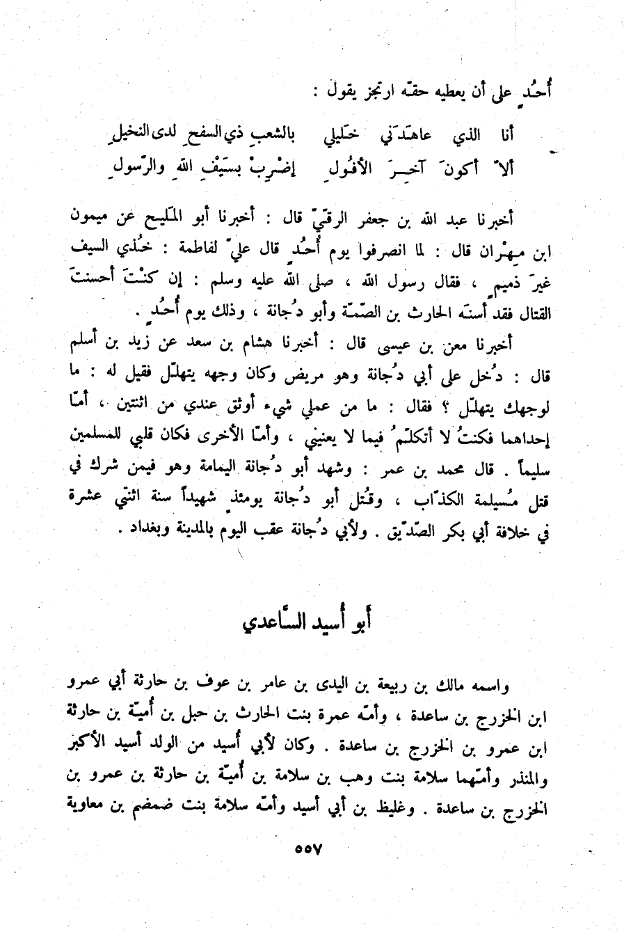 أَخْبَرَنَا مَعْنُ بْنُ عِيسَى قَالَ: أَخْبَرَنَا هِشَامُ بْنُ سَعْدٍ، عَنْ زَيْدِ بْنِ أَسْلَمَ قَالَ: " دُخِلَ عَلَى أَبِي دُجَانَةَ وَهُوَ مَرِيضٌ، وَكَانَ وَجْهُهُ يَتَهَلَّلُ، فَقِيلَ لَهُ: مَا لِوَجْهِكَ يَتَهَلَّلُ؟ فَقَالَ: " §مَا مِنْ عَمَلِي شَيْءٌ أَوْثَقُ عِنْدِي مِنَ اثْنَتَيْنِ: أَمَّا إِحْدَاهُمَا فَكُنْتُ لَا أَتَكَلَّمُ فِيمَا لَا يَعْنِينِي، وَأَمَّا الْأُخْرَى فَكَانَ قَلْبِي لِلْمُسْلِمِينَ سَلِيمًا " قَالَ مُحَمَّدُ بْنُ عُمَرُ: وَشَهِدَ أَبُو دُجَانَةَ الْيَمَامَةَ وَهُوَ فِيمَنْ شَرَكَ فِي قَتْلِ مُسَيْلِمَةَ الْكَذَّابِ، وَقُتِلَ أَبُو دُجَانَةَ يَوْمَئِذٍ شَهِيدًا سَنَةَ اثْنَتَيْ عَشْرَةَ فِي خِلَافَةِ أَبِي بَكْرٍ الصِّدِّيقِ، وَلِأَبِي دُجَانَةَ عَقِبٌ الْيَوْمَ بِالْمَدِينَةِ وَبَغْدَادَ.