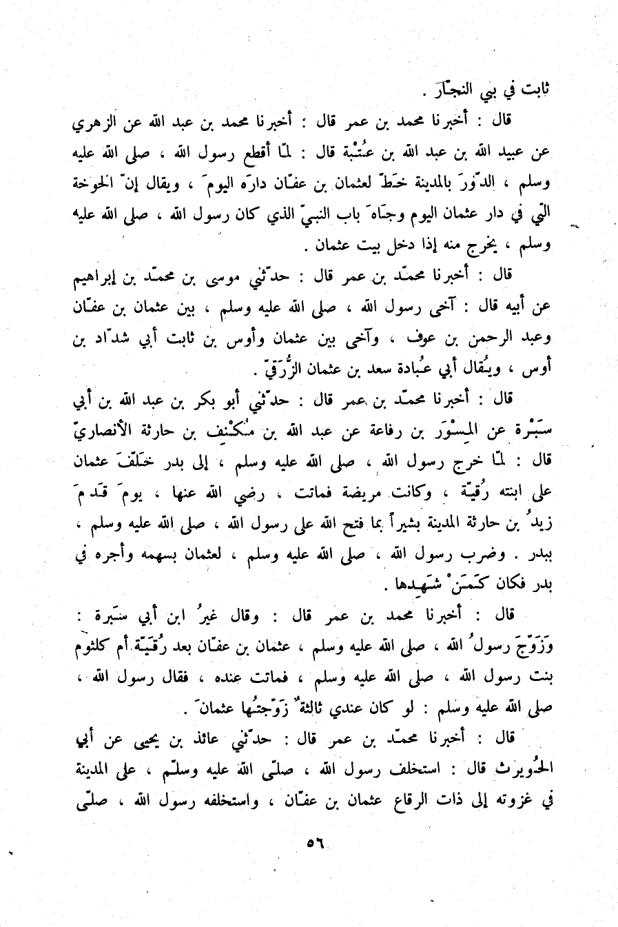 قَالَ: أَخْبَرَنَا مُحَمَّدُ بْنُ عُمَرَ قَالَ: حَدَّثَنِي مُوسَى بْنُ مُحَمَّدِ بْنِ إِبْرَاهِيمَ، عَنْ أَبِيهِ قَالَ: «§آخَى رَسُولُ اللَّهِ صلّى الله عليه وسلم بَيْنَ عُثْمَانَ بْنِ عَفَّانَ وَعَبْدِ الرَّحْمَنِ بْنِ عَوْفٍ , وآخَى بَيْنَ عُثْمَانَ وَأَوْسِ بْنِ ثَابِتٍ أَبِي شَدَّادِ بْنِ أَوْسٍ , وَيُقَالُ أَبِي عُبَادَةَ سَعْدِ بْنِ عُثْمَانَ الزُّرَقِيِّ»