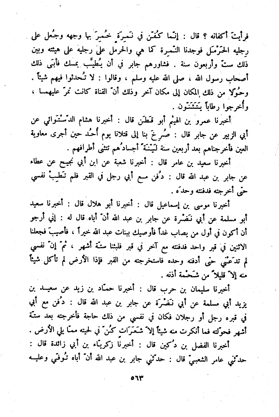 أَخْبَرَنَا سُلَيْمَانُ بْنُ حَرْبٍ قَالَ: أَخْبَرَنَا حَمَّادُ بْنُ زَيْدٍ، عَنْ سَعِيدِ بْنِ يَزِيدَ أَبِي مَسْلَمَةَ، عَنْ أَبِي نَضْرَةَ، عَنْ جَابِرِ بْنِ عَبْدِ اللَّهِ قَالَ: «§دُفِنَ مَعَ أَبِي فِي قَبْرِهِ رَجُلٌ أَوْ رَجُلَانِ، فَكَانَ فِي نَفْسِي مِنْ ذَلِكَ حَاجَةٌ، فَأَخْرَجْتُهُ بَعْدَ سِتَّةِ أَشْهُرٍ فَحَوَّلْتُهُ، فَمَا أَنْكَرْتُ مِنْهُ شَيْئًا إِلَّا شَعَرَاتٍ كُنَّ فِي لِحْيَتِهِ مِمَّا يَلِي الْأَرْضَ»