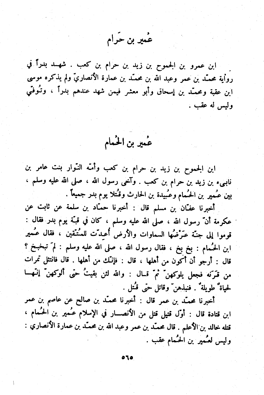 أَخْبَرَنَا مُحَمَّدُ بْنُ عُمَرَ قَالَ: أَخْبَرَنَا مُحَمَّدُ بْنُ صَالِحٍ، عَنْ عَاصِمِ بْنِ عُمَرَ بْنِ قَتَادَةَ قَالَ: «§أَوَّلُ قَتِيلٍ قُتِلَ مِنَ الْأَنْصَارِ فِي الْإِسْلَامِ عُمَيْرُ بْنُ الْحُمَامِ، قَتَلَهُ خَالِدُ بْنُ الْأَعْلَمِ» قَالَ مُحَمَّدُ بْنُ عُمَرُ، وَعَبْدُ اللَّهِ بْنُ مُحَمَّدِ بْنِ عُمَارَةَ الْأَنْصَارِيُّ: وَلَيْسَ لِعُمَيْرِ بْنِ الْحُمَامِ عَقِبٌ.