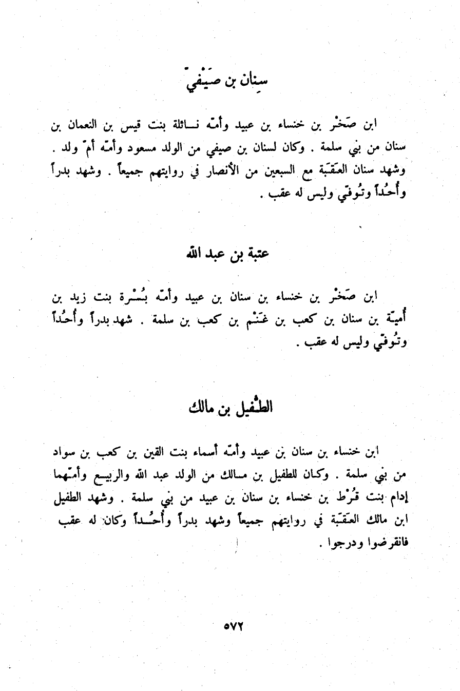 §الطُّفَيْلُ بْنُ مَالِكِ بْنِ خَنْسَاءَ بْنِ سِنَانِ بْنِ عُبَيْدٍ، وَأُمُّهُ أَسْمَاءُ بِنْتُ الْقَيْنِ بْنِ كَعْبِ بْنِ سَوَّادٍ مِنْ بَنِي سَلِمَةَ، وَكَانَ لِلطُّفَيْلِ بْنِ مَالِكٍ مِنَ الْوَلَدِ عَبْدُ اللَّهِ، وَالرَّبِيعُ، وَأُمُّهُمَا إِدَامُ بِنْتُ قُرْطِ بْنِ خَنْسَاءَ بْنِ سِنَانِ بْنِ عُبَيْدٍ مِنْ بَنِي سَلِمَةَ، وَشَهِدَ الطُّفَيْلُ بْنُ مَالِكٍ الْعَقَبَةَ فِي رِوَايَتِهِمْ جَمِيعًا، وَشَهِدَ بَدْرًا، وَأُحُدًا وَكَانَ لَهُ عَقِبٌ فَانْقَرَضُوا وَدَرَجُوا.