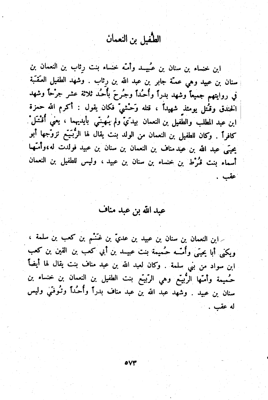 §الطُّفَيْلُ بْنُ النُّعْمَانِ بْنِ خَنْسَاءَ بْنِ سِنَانِ بْنِ عُبَيْدٍ، وَأُمُّهُ خَنْسَاءُ بِنْتُ رِئَابِ بْنِ النُّعْمَانِ بْنِ سِنَانِ بْنِ عُبَيْدٍ وَهِيَ عَمَّةُ جَابِرِ بْنِ عَبْدِ اللَّهِ بْنِ رِئَابٍ، وَشَهِدَ الطُّفَيْلُ الْعَقَبَةَ فِي رِوَايَتِهِمْ جَمِيعًا، وَشَهِدَ بَدْرًا، وَأُحُدًا وَجُرِحَ بِأُحُدٍ ثَلَاثَةَ عَشَرَ جُرْحًا، وَشَهِدَ الْخَنْدَقَ وَقُتِلَ يَوْمَئِذٍ شَهِيدًا، قَتَلَهُ وَحْشِيُّ فَكَانَ يَقُولُ: «أَكْرَمَ اللَّهُ حَمْزَةَ بْنَ عَبْدِ الْمُطَّلِبِ وَالطُّفَيْلَ بْنَ النُّعْمَانِ بِيَدَيَّ وَلَمْ يُهِنِّي بِأَيْدِيهِمَا، يَعْنِي أُقْتَلْ كَافِرًا» ، وَكَانَ لِلطُّفَيْلِ بْنِ النُّعْمَانِ مِنَ الْوَلَدِ بِنْتٌ يُقَالُ لَهَا الرُّبَيِّعُ تَزَوَّجَهَا أَبُو يَحْيَى عَبْدُ اللَّهِ بْنُ عَبْدِ مَنَافِ بْنِ النُّعْمَانِ بْنِ سِنَانِ بْنِ عُبَيْدٍ، فَوَلَدَتْ لَهُ، وَأُمُّهَا أَسْمَاءُ بِنْتُ قُرْطِ بْنِ خَنْسَاءِ بْنِ سِنَانِ بْنِ عُبَيْدٍ، وَلَيْسَ لِلطُّفَيْلِ بْنِ النُّعْمَانِ عَقِبٌ.
