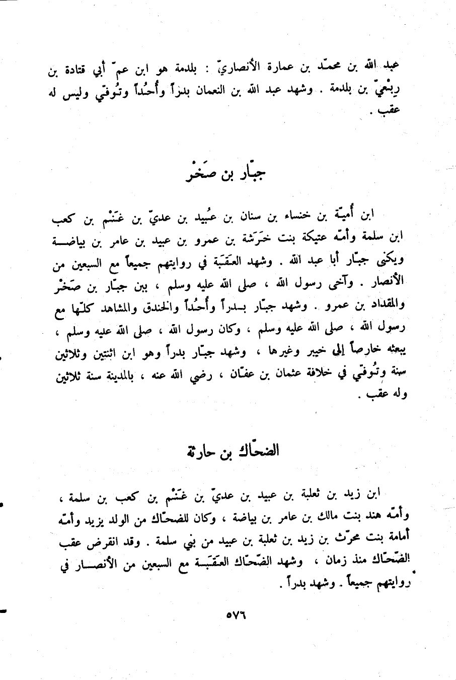 §جَبَّارُ بْنُ صَخْرِ بْنِ أُمَيَّةَ بْنِ خَنْسَاءَ بْنِ سِنَانِ بْنِ عُبَيْدِ بْنِ عَدِيِّ بْنِ غَنْمِ بْنِ كَعْبِ بْنِ سَلَمَةَ، وَأُمُّهُ عَتِيكَةُ بِنْتُ خَرَشَةَ بْنِ عَمْرِو بْنِ عُبَيْدِ بْنِ عَامِرِ بْنِ بَيَاضَةَ، وَيُكْنَى جَبَّارٌ أَبَا عَبْدِ اللَّهِ، وَشَهِدَ الْعَقَبَةَ فِي رِوَايَتِهِمْ جَمِيعًا مَعَ السَّبْعِينَ مِنَ الْأَنْصَارِ، وآخَى رَسُولُ اللَّهِ صلّى الله عليه وسلم بَيْنَ جَبَّارِ بْنِ صَخْرٍ وَالْمِقْدَادِ بْنِ عَمْرٍو، وَشَهِدَ جَبَّارٌ بَدْرًا، وَأُحُدًا، وَالْخَنْدَقَ، وَالْمَشَاهِدَ كُلَّهَا مَعَ رَسُولِ اللَّهِ صلّى الله عليه وسلم، وَكَانَ رَسُولُ اللَّهِ صلّى الله عليه وسلم يَبْعَثُهُ خَارِصًا إِلَى خَيْبَرَ وَغَيْرِهَا، وَشَهِدَ جَبَّارٌ بَدْرًا وَهُوَ ابْنُ اثْنَيْنِ وَثَلَاثِينَ سَنَةً، وَتُوُفِّيَ فِي خِلَافَةِ عُثْمَانَ بْنِ عَفَّانَ رَضِيَ اللَّهُ عَنْهُ بِالْمَدِينَةِ سَنَةً ثَلَاثِينَ، وَلَهُ عَقِبٌ.