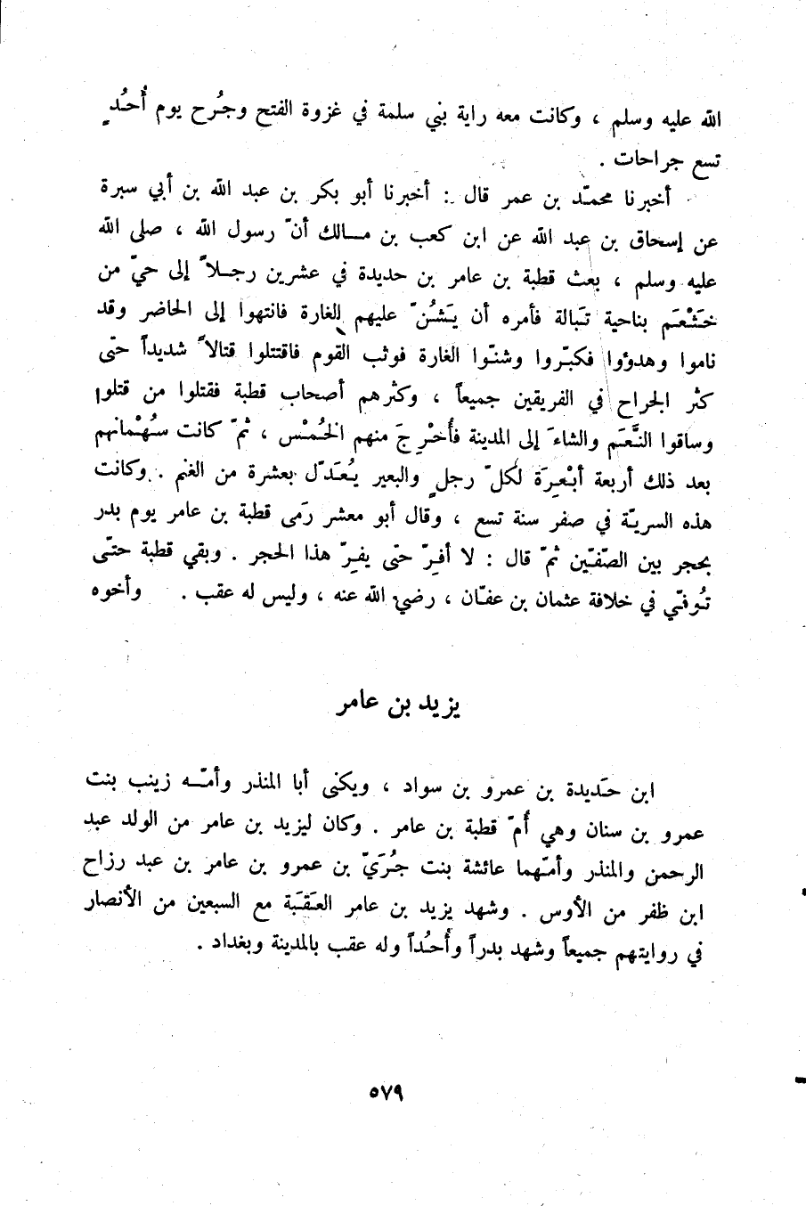 أَخْبَرَنَا مُحَمَّدُ بْنُ عُمَرَ قَالَ: أَخْبَرَنَا أَبُو بَكْرِ بْنُ عَبْدِ اللَّهِ بْنِ أَبِي سَبْرَةَ، عَنْ إِسْحَاقَ بْنِ عَبْدِ اللَّهِ، عَنِ ابْنِ كَعْبِ بْنِ مَالِكٍ: «أَنَّ رَسُولَ اللَّهِ صلّى الله عليه وسلم §بَعَثَ قُطْبَةَ بْنَ عَامِرِ بْنِ حَدِيدَةَ فِي عِشْرِينَ رَجُلًا إِلَى حَيٍّ مِنْ خَثْعَمٍ بِنَاحِيَةِ تَبَالَةَ، فَأَمَرَهُ أَنْ يَشُنَّ عَلَيْهِمُ الْغَارَةَ، فَانْتَهُوا إِلَى الْحَاضِرِ وَقَدْ نَامُوا وَهَدُؤُوا، فَكَبَّرُوا وَشَنُّوا الْغَارَةَ، فَوَثَبَ الْقَوْمُ فَاقْتَتَلُوا قِتَالًا شَدِيدًا حَتَّى كَثُرَ الْجِرَاحُ فِي الْفَرِيقَيْنِ جَمِيعًا، وَكَثَرَهُمْ أَصْحَابُ قُطْبَةَ فَقَتَلُوا مَنْ قَتَلُوا وَسَاقُوا النَّعَمَ وَالشَّاءَ إِلَى الْمَدِينَةِ فَأُخْرِجَ مِنْهُمُ الْخُمُسَ، ثُمَّ كَانَتْ سُهْمَانُهُمْ بَعْدَ ذَلِكَ أَرْبَعَةَ أَبْعِرَةٍ لِكُلِّ رَجُلٍ، وَالْبَعِيرُ يَعْدِلُ بِعَشَرَةٍ مِنَ الْغَنَمِ، وَكَانَتْ هَذِهِ السَّرِيَّةُ فِي صَفَرٍ سَنَةَ تِسْعٍ» وَقَالَ أَبُو مَعْشَرٍ: رَمَى قُطْبَةُ بْنُ عَامِرٍ يَوْمَ بَدْرٍ بِحَجَرٍ بَيْنَ الصَّفَّيْنِ ثُمَّ قَالَ: «لَا أَفِرُّ حَتَّى يَفِرَّ هَذَا الْحَجَرُ» ، وَبَقِيَ قُطْبَةُ حَتَّى تُوُفِّيَ فِي خِلَافَةِ عُثْمَانَ بْنِ عَفَّانَ رَضِيَ اللَّهُ عَنْهُ وَلَيْسَ لَهُ عَقِبٌ