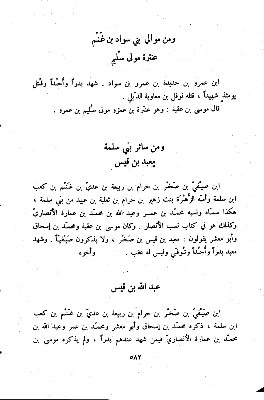 §وَأَخُوهُ عَبْدُ اللَّهِ بْنُ قَيْسِ بْنِ صَيْفِيِّ بْنِ صَخْرِ بْنِ حَرَامِ بْنِ رَبِيعَةَ بْنِ عَدِيِّ بْنِ غَنْمِ بْنِ كَعْبِ بْنِ سَلَمَةَ، ذَكَرَهُ مُحَمَّدُ بْنُ إِسْحَاقَ وَأَبُو مَعْشَرٍ وَمُحَمَّدُ بْنُ عُمَرَ وَعَبْدُ اللَّهِ بْنُ مُحَمَّدِ بْنِ عُمَارَةَ الْأَنْصَارِيُّ فِيمَنْ شَهِدَ عِنْدَهُمْ بَدْرًا، وَلَمْ يَذْكُرْهُ مُوسَى بْنُ -[583]- عُقْبَةَ فِي كِتَابِهِ فِيمَنْ شَهِدَ بَدْرًا. وَشَهِدَ أَيْضًا عَبْدُ اللَّهِ أُحُدًا، وَتُوُفِّيَ وَلَيْسَ لَهُ عَقِبٌ.