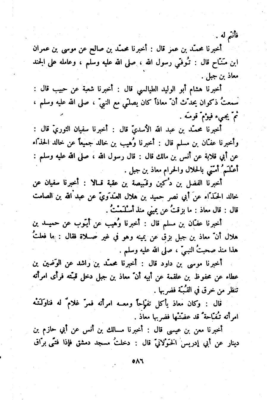 أَخْبَرَنَا مُحَمَّدُ بْنُ عَبْدِ اللَّهِ الْأَسَدِيُّ قَالَ: أَخْبَرَنَا سُفْيَانُ الثَّوْرِيُّ قَالَ: وَأَخْبَرَنَا عَفَّانُ بْنُ مُسْلِمٍ قَالَ: أَخْبَرَنَا وُهَيْبُ بْنُ خَالِدٍ، جَمِيعًا عَنْ خَالِدٍ الْحَذَّاءِ، عَنْ أَبِي قِلَابَةَ، عَنْ أَنَسِ بْنِ مَالِكٍ قَالَ: قَالَ رَسُولُ اللَّهِ صلّى الله عليه وسلم: «§أَعْلَمُ أُمَّتِي بِالْحَلَالِ وَالْحَرَامِ مُعَاذُ بْنُ جَبَلٍ»