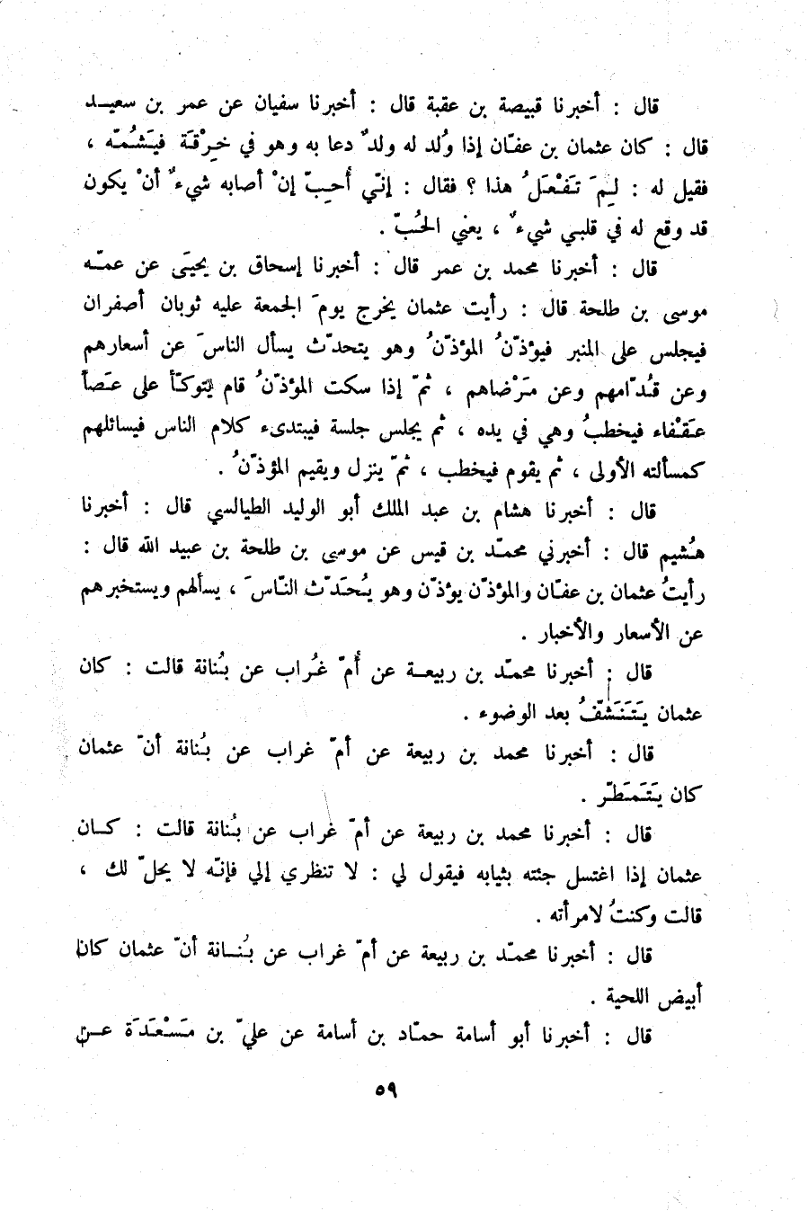 قَالَ: أَخْبَرَنَا هِشَامُ بْنُ عَبْدِ الْمَلِكِ أَبُو الْوَلِيدِ الطَّيَالِسِيُّ قَالَ: أَخْبَرَنَا هُشَيْمٌ قَالَ: أَخْبَرَنِي مُحَمَّدُ بْنُ قَيْسٍ، عَنْ مُوسَى بْنِ طَلْحَةَ بْنِ عُبَيْدِ اللَّهِ قَالَ: «§رَأَيْتُ عُثْمَانَ بْنَ عَفَّانَ وَالْمُؤَذِّنُ يُؤَذِّنُ وَهُوَ يُحَدِّثُ النَّاسَ يَسْأَلُهُمْ وَيَسْتَخْبِرُهُمْ عَنِ الْأَسْعَارِ وَالْأَخْبَارِ»