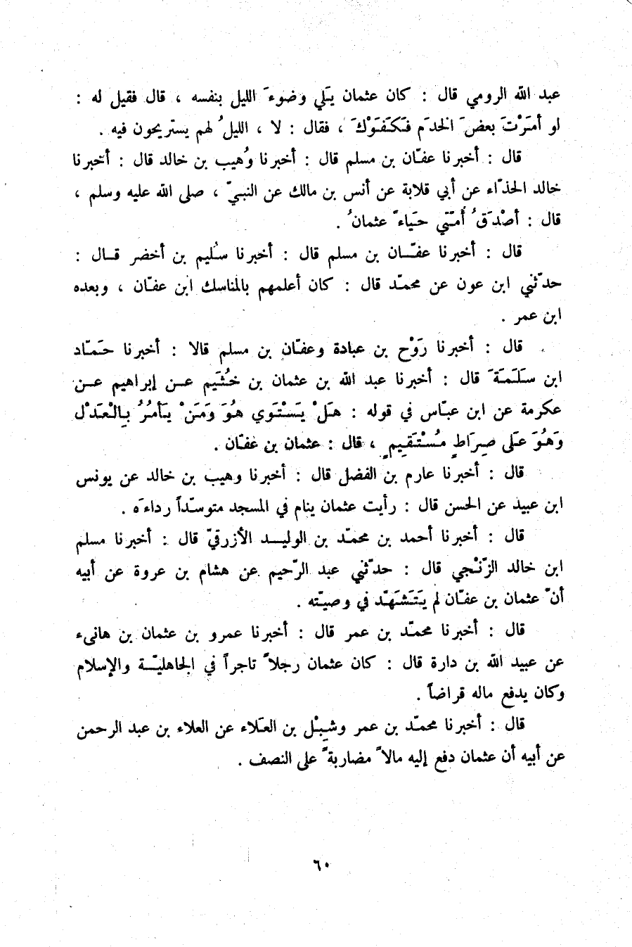 قَالَ: أَخْبَرَنَا عَفَّانُ بْنُ مُسْلِمٍ قَالَ: أَخْبَرَنَا وُهَيْبُ بْنُ خَالِدٍ قَالَ: أَخْبَرَنَا خَالِدُ الْحَذَّاءُ، عَنْ أَبِي قِلَابَةَ، عَنْ أَنَسِ بْنِ مَالِكٍ، عَنِ النَّبِيِّ صلّى الله عليه وسلم قَالَ: «§أَصْدَقُ أُمَّتِي حَيَاءً عُثْمَانُ»