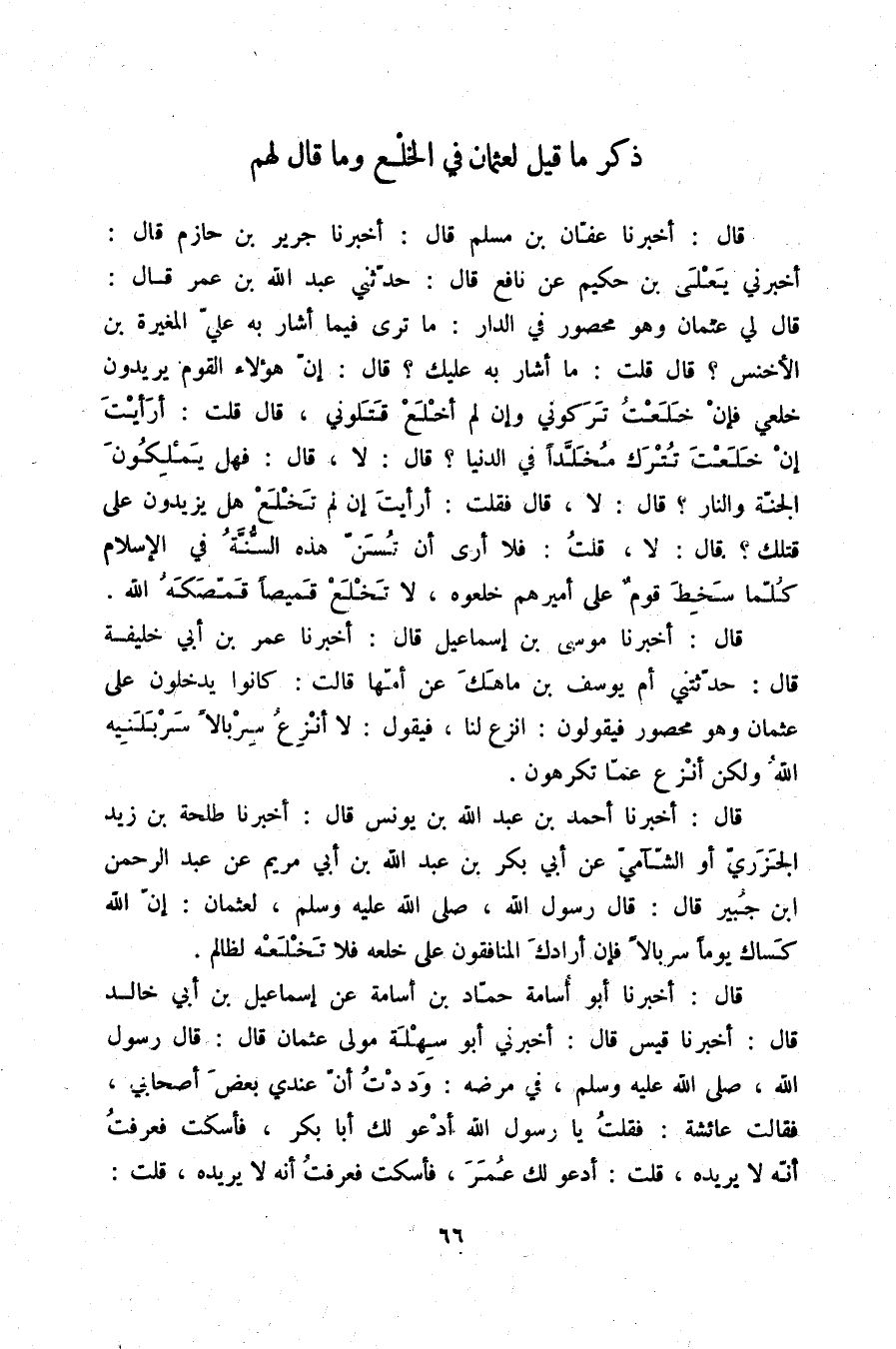 قَالَ: أَخْبَرَنَا عَفَّانُ بْنُ مُسْلِمٍ قَالَ: أَخْبَرَنَا جَرِيرُ بْنُ حَازِمٍ قَالَ: أَخْبَرَنِي يَعْلَى بْنُ حَكِيمٍ، عَنْ نَافِعٍ قَالَ: حَدَّثَنِي عَبْدُ اللَّهِ بْنُ عُمَرَ قَالَ: " قَالَ لِي عُثْمَانُ وَهُوَ مَحْصُورٌ فِي الدَّارِ: مَا تَرَى فِيمَا أَشَارَ بِهِ عَلَيَّ الْمُغِيرَةُ بْنُ الْأَخْنَسِ , قَالَ: قُلْتُ: مَا أَشَارَ بِهِ عَلَيْكَ؟ قَالَ: " §إِنَّ هَؤُلَاءِ الْقَوْمَ يُرِيدُونَ خَلْعِي، فَإِنْ خَلَعْتُ تَرَكُونِي، وَإِنْ لَمْ أَخْلَعْ قَتَلُونِي , قَالَ: قُلْتُ: أَرَأَيْتَ إِنْ خَلَعْتَ تُتْرَكُ مُخَلَّدًا فِي الدُّنْيَا , قَالَ: لَا , قَالَ: فَهَلْ يَمْلِكُونَ الْجَنَّةَ وَالنَّارَ؟ قَالَ: لَا , قَالَ: فَقُلْتُ: أَرَأَيْتَ إِنْ لَمْ تَخْلَعْ هَلْ يَزِيدُونَ عَلَى قَتْلِكَ؟ قَالَ: لَا , قُلْتُ: فَلَا أَرَى أَنْ تُسُنَّ هَذِهِ السُّنَّةَ فِي الْإِسْلَامِ، كُلَّمَا سَخِطَ قَوْمٌ عَلَى أَمِيرِهِمْ خَلَعُوهُ , لَا تَخْلَعْ قَمِيصًا قَمَّصَكَهُ اللَّهُ "