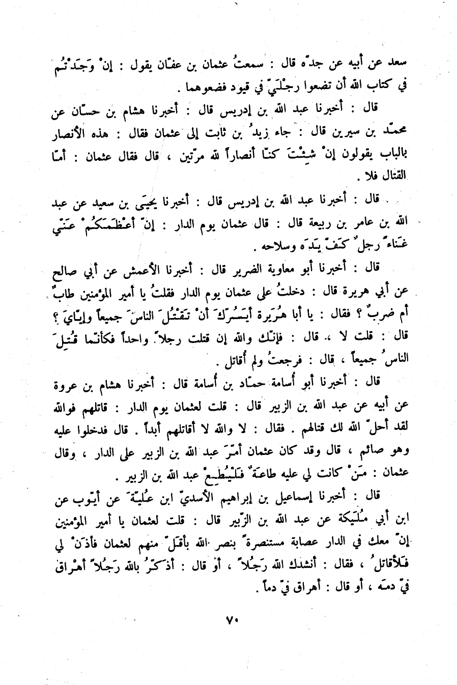 قَالَ: أَخْبَرَنَا إِسْمَاعِيلُ بْنُ إِبْرَاهِيمَ الْأَسَدِيِّ ابْنِ عُلَيَّةَ، عَنْ أَيُّوبَ، عَنِ ابْنِ أَبِي مُلَيكَةَ، عَنْ عَبْدِ اللَّهِ بْنِ الزُّبَيْرِ قَالَ: " قُلْتُ لِعُثْمَانَ: يَا أَمِيرَ الْمُؤْمِنِينَ، §إِنَّ مَعَكَ فِي الدَّارِ عِصَابَةً مُسْتَنْصَرَةً بِنَصْرِ اللَّهِ بِأَقَلَّ مِنْهُمْ لِعُثْمَانَ، فَأْذَنْ لِي فَلْأُقَاتِلُ , فَقَالَ: أَنْشُدُكَ اللَّهَ رَجُلًا، أَوْ قَالَ: أَذَّكِّرُ بِاللَّهِ رَجُلًا أَهْرَاقَ فِيَّ دَمُهُ، أَوْ قَالَ: أَهْرَاقَ فِيَّ دَمًا "
