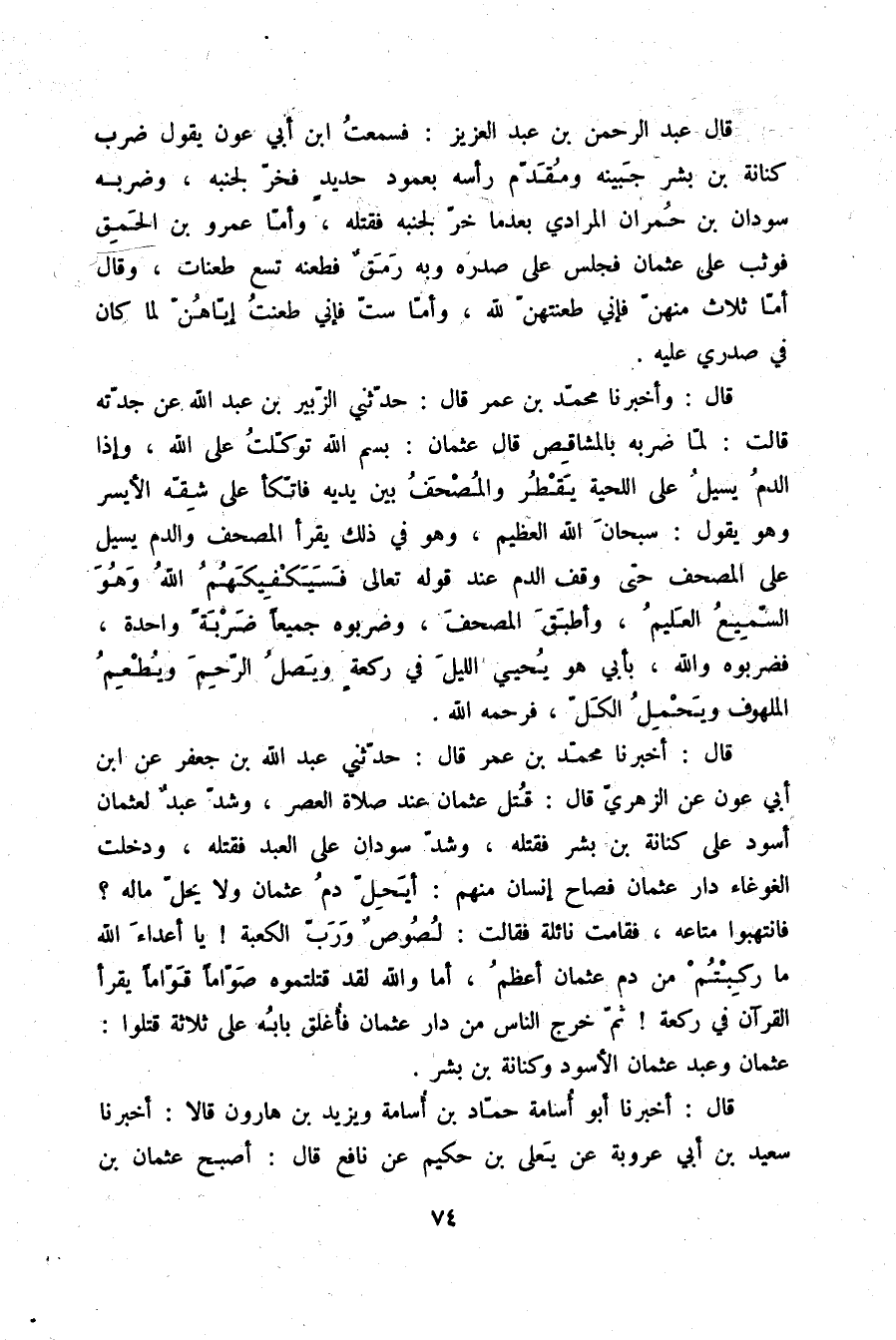 قَالَ: أَخْبَرَنَا مُحَمَّدُ بْنُ عُمَرَ قَالَ: حَدَّثَنِي عَبْدُ اللَّهِ بْنُ جَعْفَرٍ، عَنِ ابْنِ أَبِي عَوْنٍ، عَنِ الزُّهْرِيِّ قَالَ: " §قُتِلَ عُثْمَانُ عِنْدَ صَلَاةِ الْعَصْرِ , وَشَدَّ عَبْدٌ لِعُثْمَانَ أَسْوَدُ عَلَى كِنَانَةَ بْنِ بِشْرٍ فَقَتَلَهُ , وَشَدَّ سَوْدَانُ عَلَى الْعَبْدِ فَقَتَلَهُ , وَدَخَلَتِ الْغَوْغَاءُ دَارَ عُثْمَانَ فَصَاحَ إِنْسَانٌ مِنْهُمْ: أَيَحِلُّ دَمُ عُثْمَانَ وَلَا يَحِلُّ مَالُهُ؟ فَانْتَهَبُوا مَتَاعَهُ , فَقَامَتْ نَائِلَةُ فَقَالَتْ: لُصُوصٌ وَرَبِّ الْكَعْبَةِ، يَا أَعْدَاءَ اللَّهِ، مَا رَكِبْتُمْ مِنْ دَمِ عُثْمَانَ أَعْظَمُ , أَمَا وَاللَّهِ لَقَدْ قَتَلْتُمُوهُ صَوَّامًا قَوَّامًا، يَقْرَأُ الْقُرْآنَ فِي رَكْعَةٍ , ثُمَّ خَرَجَ النَّاسُ مِنْ دَارِ عُثْمَانَ فَأُغْلِقَ بَابُهُ عَلَى ثَلَاثَةٍ قُتِلُوا: عُثْمَانَ , وَعَبْدِ عُثْمَانَ الْأَسْوَدِ , وَكِنَانَةَ بْنِ بِشْرٍ "