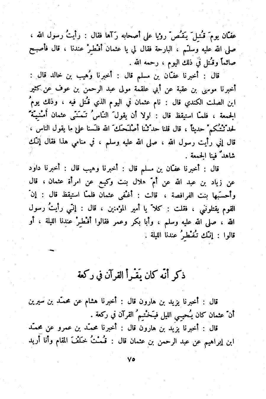 قَالَ: أَخْبَرَنَا يَزِيدُ بْنُ هَارُونَ قَالَ: أَخْبَرَنَا هِشَامٌ، عَنْ مُحَمَّدِ بْنِ سِيرِينَ: «§أَنَّ عُثْمَانَ كَانَ يُحْيِي اللَّيْلَ فَيَخْتِمُ الْقُرْآنَ فِي رَكْعَةٍ»