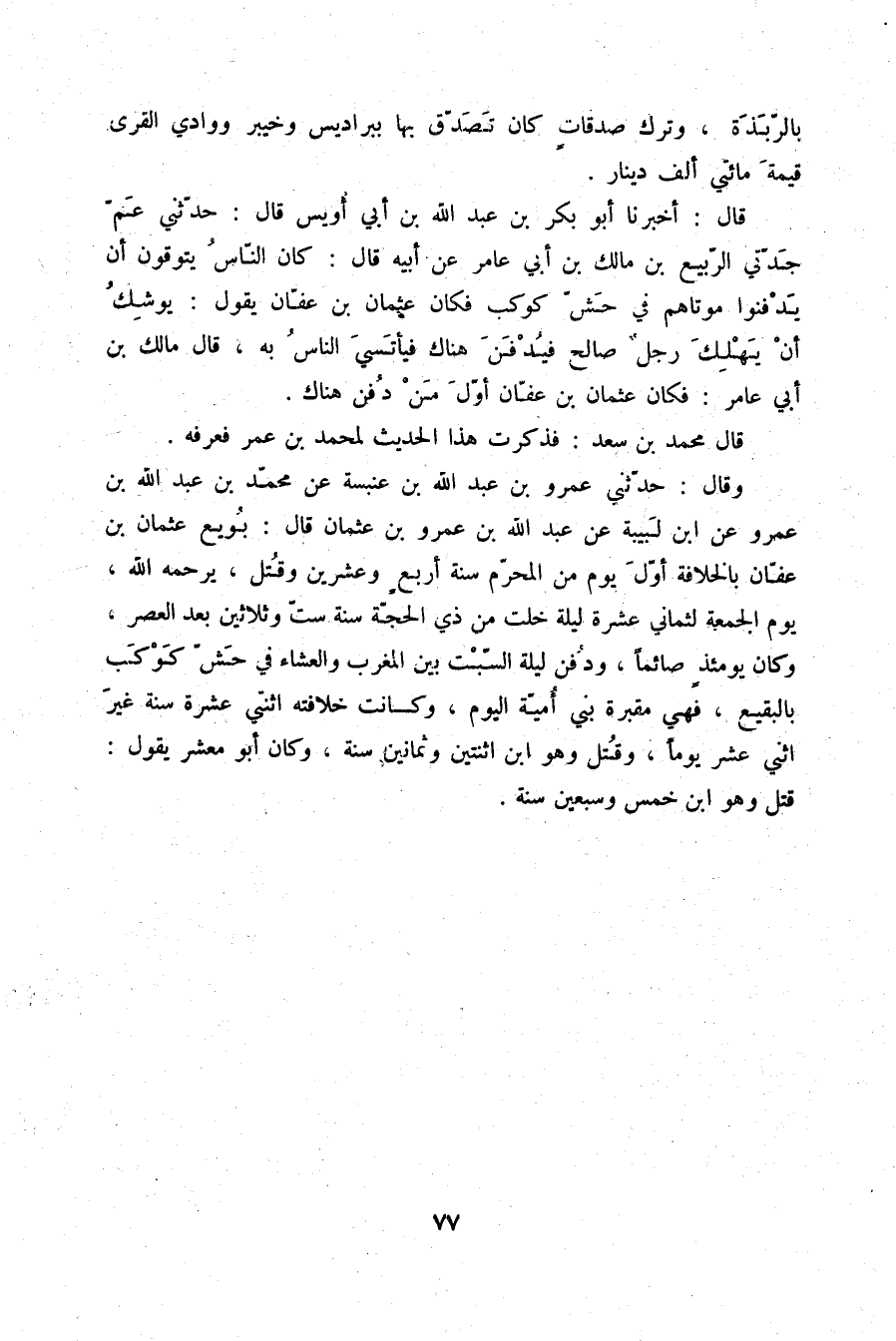قَالَ: أَخْبَرَنَا أَبُو بَكْرِ بْنُ عَبْدِ اللَّهِ بْنِ أَبِي أُوَيْسٍ قَالَ: حَدَّثَنِي عَمُّ جَدَّتِي الرَّبِيعُ بْنُ مَالِكِ بْنِ أَبِي عَامِرٍ، عَنْ أَبِيهِ قَالَ: " §كَانَ النَّاسُ يَتُوقُونَ أَنْ يَدْفِنُوا مَوْتَاهُمْ فِي حَشِّ كَوْكَبٍ، فَكَانَ عُثْمَانُ بْنُ عَفَّانَ يَقُولُ: يُوشِكُ أَنْ يَهْلِكَ رَجُلٌ صَالِحٌ فَيُدْفَنُ هُنَاكَ، فَيَأْتَسِيَ النَّاسُ بِهِ ". قَالَ مَالِكُ بْنُ أَبِي عَامِرٍ: فَكَانَ عُثْمَانُ بْنُ عَفَّانَ أَوَّلُ مَنْ دُفِنَ هُنَاكَ " قَالَ مُحَمَّدُ بْنُ سَعْدٍ: فَذَكَرْتُ هَذَا الْحَدِيثَ لِمُحَمَّدِ بْنِ عُمَرَ فَعَرَفَهُ.