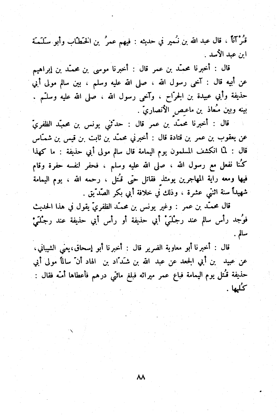 قَالَ: أَخْبَرَنَا مُحَمَّدُ بْنُ عُمَرَ قَالَ: حَدَّثَنِي يُونُسُ بْنُ مُحَمَّدٍ الظَّفَرِيُّ، عَنْ يَعْقُوبَ بْنِ عُمَرَ بْنِ قَتَادَةَ قَالَ: أَخْبَرَنِي مُحَمَّدُ بْنُ ثَابِتِ بْنِ قَيْسِ بْنِ شَمَّاسٍ قَالَ: " لَمَّا انْكَشَفَ الْمُسْلِمُونَ يَوْمَ الْيَمَامَةِ قَالَ سَالِمٌ مَوْلَى أَبِي حُذَيْفَةَ: «§مَا هَكَذَا كُنَّا نَفْعَلُ مَعَ رَسُولِ اللَّهِ صلّى الله عليه وسلم، فَحَفَرَ لِنَفْسِهِ حُفْرَةً وَقَامَ فِيهَا وَمَعَهُ رَايَةُ الْمُهَاجِرِينَ يَوْمَئِذٍ فَقَاتَلَ حَتَّى قُتِلَ، رَحِمَهُ اللَّهُ، يَوْمَ الْيَمَامَةِ شَهِيدًا سَنَةَ اثْنَتَيْ عَشْرَةَ، وَذَلِكَ فِي خِلَافَةِ أَبِي بَكْرٍ الصِّدِّيقِ» . قَالَ مُحَمَّدُ بْنُ عُمَرَ وَغَيْرُ يُونُسَ بْنِ مُحَمَّدٍ الظَّفَرِيِّ يَقُولُ فِي هَذَا الْحَدِيثِ: «فَوُجِدَ رَأْسُ سَالِمٍ عِنْدَ رِجْلَيْ أَبِي حُذَيْفَةَ أَوْ رَأْسِ أَبِي حُذَيْفَةَ عِنْدَ رِجْلَيْ سَالِمٍ»