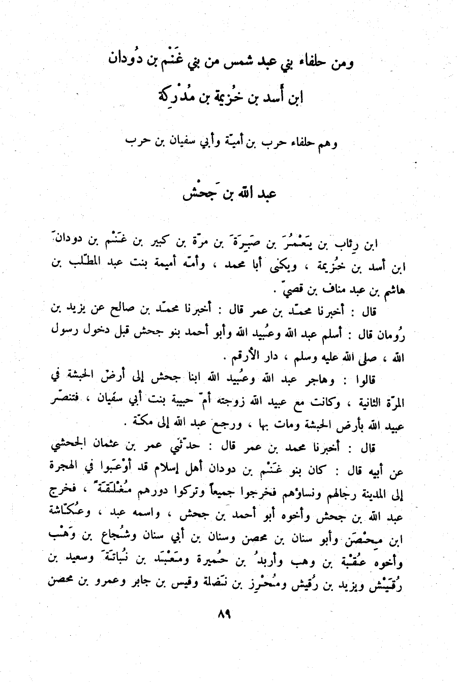 قَالَ: أَخْبَرَنَا مُحَمَّدُ بْنُ عُمَرَ قَالَ: حَدَّثَنِي عُمَرُ بْنُ عُثْمَانَ الْجَحْشِيُّ، عَنْ أَبِيهِ قَالَ: «§كَانَ بَنُو غَنْمِ بْنُ دُودَانَ أَهْل الْإِسْلَامِ قَدْ أَوْعَبُوا فِي الْهِجْرَةِ إِلَى الْمَدِينَةِ رِجَالُهُمْ وَنِسَاؤُهُمْ، فَخَرَجُوا جَمِيعًا وَتَرَكُوا دُورَهُمْ مُغْلَقَةٌ، فَخَرَجَ عَبْدُ اللَّهِ بْنُ جَحْشٍ وَأَخُوهُ أَبُو أَحْمَدَ بْنُ جَحْشٍ وَاسْمُهُ عَبْدٌ، وَعُكَّاشَةُ بْنُ مِحْصَنٍ , وَأَبُو سِنَانِ بْنُ مِحْصَنٍ , وَسِنَانُ بْنُ أَبِي سِنَانٍ , وَشُجَاعُ بْنُ وَهْبٍ وَأَخُوهُ عُقْبَةُ بْنُ وَهْبٍ , وأَرْبَدُ بْنُ حُمَيْرَةَ , وَمَعْبَدُ بْنُ نُبَاتَةَ , وَسَعِيدُ بْنُ رُقَيْشٍ , وَيَزِيدُ بْنُ رُقَيْشٍ , وَمُحْرِزُ بْنُ نَضْلَةَ , وَقَيْسُ بْنُ جَابِرٍ , وَعَمْرُو بْنُ مِحْصَنِ -[90]- بْنِ مَالِكٍ , وَمَالِكُ بْنُ عَمْرٍو , وَصَفْوَانُ بْنُ عَمْرٍو , وَثقَافُ بْنُ عَمْرٍو , وَرَبِيعَةُ بْنُ أَكْثَمَ، وَزُبَيرُ بْنُ عُبَيْدٍ فَنَزَلُوا جَمِيعًا عَلَى مُبَشِّرِ بْنِ عَبْدِ الْمُنْذِرِ»