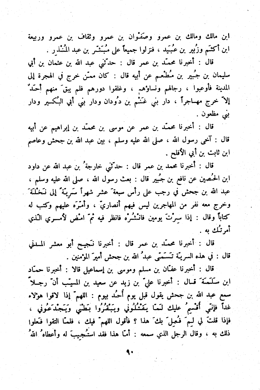 قَالَ: أَخْبَرَنَا مُحَمَّدُ بْنُ عُمَرَ قَالَ: أَخْبَرَنَا نَجِيحٌ أَبُو مَعْشَرٍ الْمَدَنِيُّ قَالَ: «فِي هَذِهِ السَّرِيَّةِ §تَسَمَّى عَبْدُ اللَّهِ بْنُ جَحْشٍ أَمِيرَ الْمُؤْمِنِينَ»
