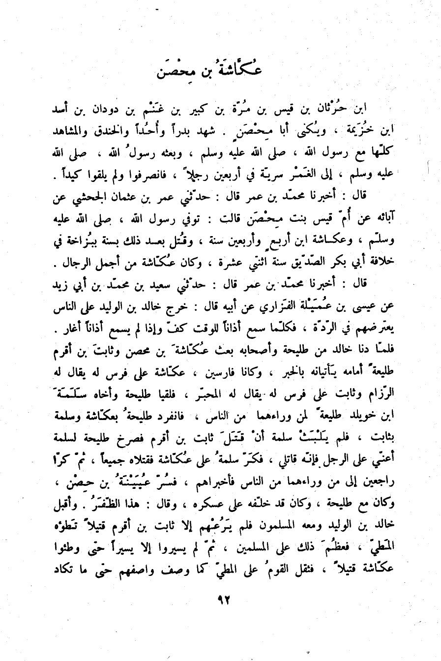 قَالَ: أَخْبَرَنَا مُحَمَّدُ بْنُ عُمَرَ قَالَ: حَدَّثَنِي عُمَرُ بْنُ عُثْمَانَ الْجَحْشِيُّ، عَنْ آبَائِهِ، عَنْ أُمِّ قَيْسِ بِنْتِ مِحْصَنٍ، قَالَتْ: §تُوُفِّيَ رَسُولُ اللَّهِ صلّى الله عليه وسلم، وَعُكَّاشَةُ ابْنُ أَرْبَعٍ وَأَرْبَعِينَ سَنَةً، وَقُتِلَ بَعْدَ ذَلِكَ بِسَنَةٍ بِبُزَاخَةَ فِي خِلَافَةِ أَبِي بَكْرٍ الصِّدِّيقِ سَنَةَ اثْنَتَيْ عَشْرَةَ، وَكَانَ عُكَّاشَةُ مِنْ أَجْمَلِ الرِّجَالِ "