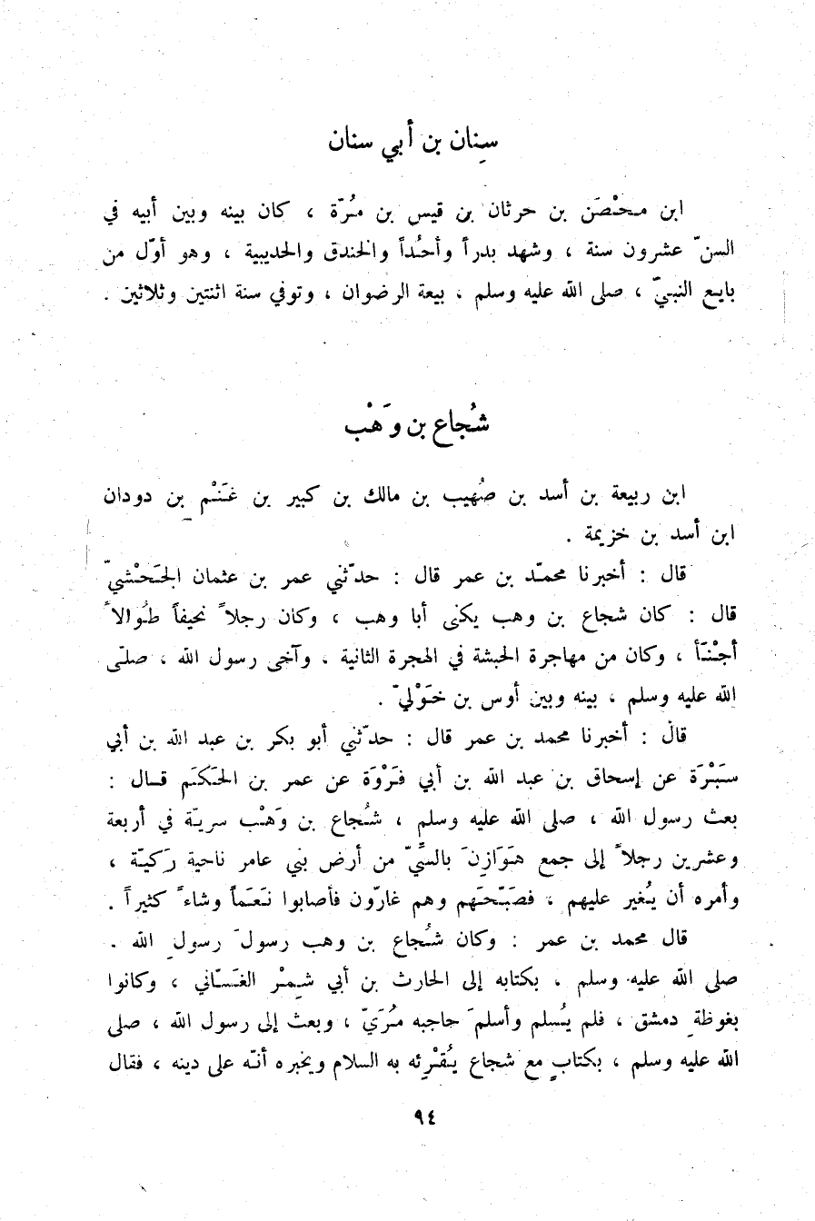قَالَ: أَخْبَرَنَا مُحَمَّدُ بْنُ عُمَرَ قَالَ: حَدَّثَنِي أَبُو بَكْرِ بْنُ عَبْدِ اللَّهِ بْنِ أَبِي سَبْرَةَ، عَنْ إِسْحَاقَ بْنِ عَبْدِ اللَّهِ بْنِ أَبِي فَرْوَةَ، عَنْ عُمَرَ بْنِ الْحَكَمِ قَالَ: «§بَعَثَ رَسُولُ اللَّهِ صلّى الله عليه وسلم شُجَاعَ بْنَ وَهْبٍ سَرِيَّةً فِي أَرْبَعَةٍ وَعِشْرِينَ رَجُلًا إِلَى جَمْعِ هَوَازِنَ بِالسَّيِّ مِنْ أَرْضِ بَنِي عَامِرٍ نَاحِيَةَ رَكِيَّةَ، وَأَمَرَهُ أَنْ يُغِيرَ عَلَيْهِمْ، فَصَبَّحَهُمْ وَهُمْ غَارُّونَ فَأَصَابُوا نَعَمًا وَشَاءً كَثِيرًا» قَالَ مُحَمَّدُ بْنُ عُمَرَ: وَكَانَ شُجَاعُ بْنُ وَهْبٍ رَسُولَ رَسُولِ اللَّهِ صلّى الله عليه وسلم بِكِتَابِهِ إِلَى الْحَارِثِ بْنِ أَبِي شِمْرٍ الْغَسَّانِيِّ وَكَانُوا بِغَوْطَةِ دِمَشْقَ، فَلَمْ يُسْلِمْ وَأَسْلَمَ حَاجِبُهُ مُرِيُّ، وَبَعَثَ إِلَى رَسُولِ اللَّهِ صلّى الله عليه وسلم بِكِتَابٍ مَعَ شُجَاعٍ يُقْرِئُهُ بِهِ السَّلَامَ وَيُخْبِرُهُ أَنَّهُ عَلَى دِينِهِ، فَقَالَ -[95]- رَسُولُ اللَّهِ صلّى الله عليه وسلم: «صَدَقَ» ، وَشَهِدَ شُجَاعُ بَدْرًا، وَأُحُدًا، وَالْخَنْدَقَ وَالْمَشَاهِدَ كُلَّهَا مَعَ رَسُولِ اللَّهِ صلّى الله عليه وسلم، وَقُتِلَ يَوْمَ الْيَمَامَةِ شَهِيدًا سَنَةَ اثْنَتَيْ عَشْرَةَ وَهُوَ ابْنُ بِضْعٍ وَأَرْبَعِينَ سَنَةً