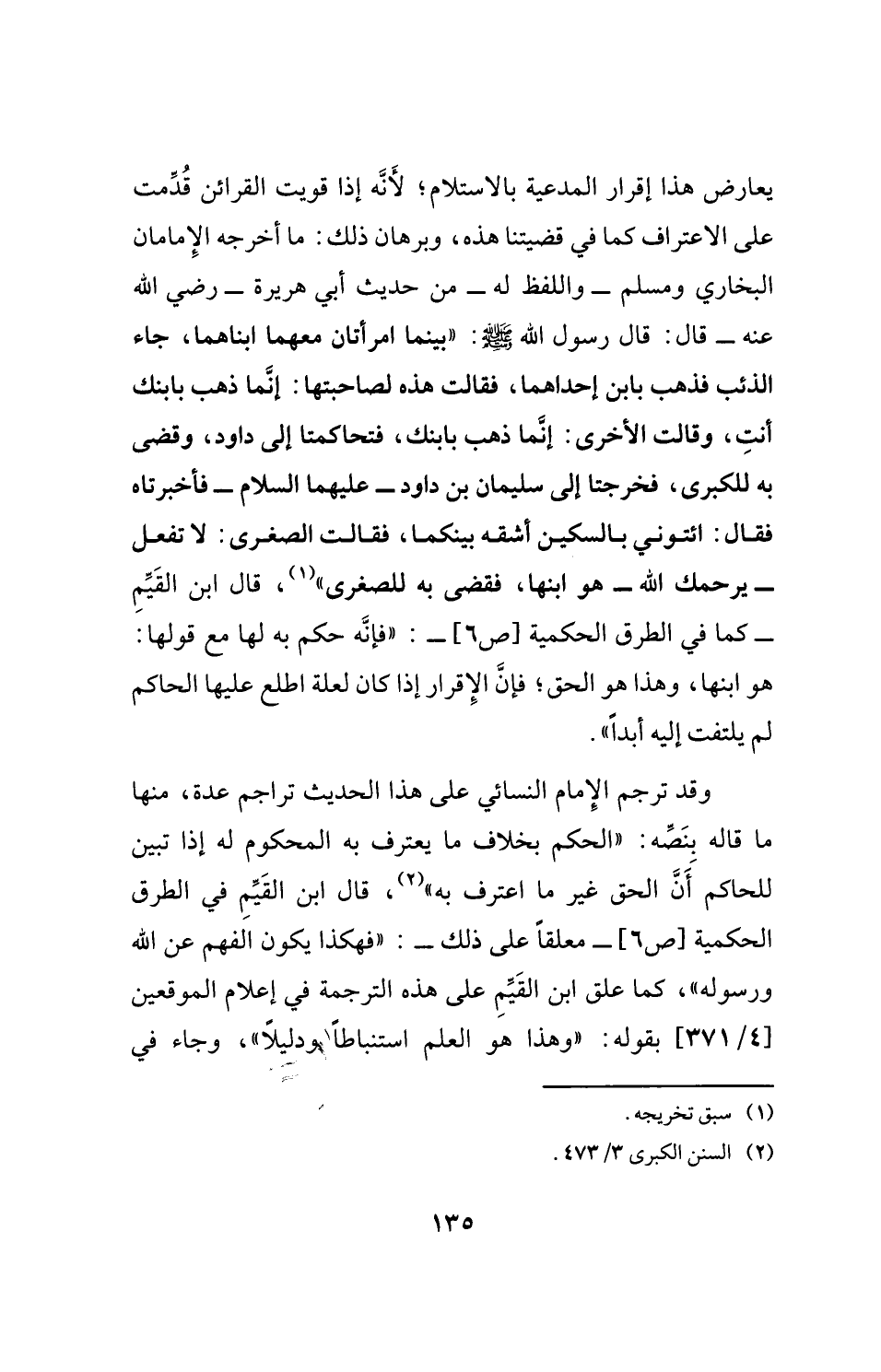 يعارض هذا إقرار المدعية بالاستلام؛ لأَنَّه إذا قويت القرائن قُدِّمت على الاعتراف كما في قضيتنا هذه، وبرهان ذلك: ما أخرجه الإمامان البُخاريّ ومسلم -واللفظ له- من حديث أبي هريرة -رضي الله عنه - قال: قال رسول الله - صلى الله عليه وسلم -: "بينما امرأتان معهما ابناهما، جاء الذئب فذهب بابن إحداهما، فقالت هذه لصاحبتها: إنَّما ذهب بابنك أنتِ، وقالت الأخرى: إنَّما ذهب بابنك، فتحاكمتا إلى داود، وقضى به للكبرى، فخرجتا إلى سليمان بن داود -عليهما السلام - فأخبرتاه فقال: ائتوني بالسكين أشقه بينكما، فقالت الصغرى: لا تفعل - يرحمك الله- هو ابنها، فقضى به للصغرى" (¬1)، قال ابن القَيِّمِ - كما في الطرق الحكمية [ص 6]-: "فإنَّه حكم به لها مع قولها: وهو ابنها، وهذا هو الحق؛ فإن الإقرار إذا كان لعلة اطلع عليها الحاكم لم يلتفت إليه أبدًا".