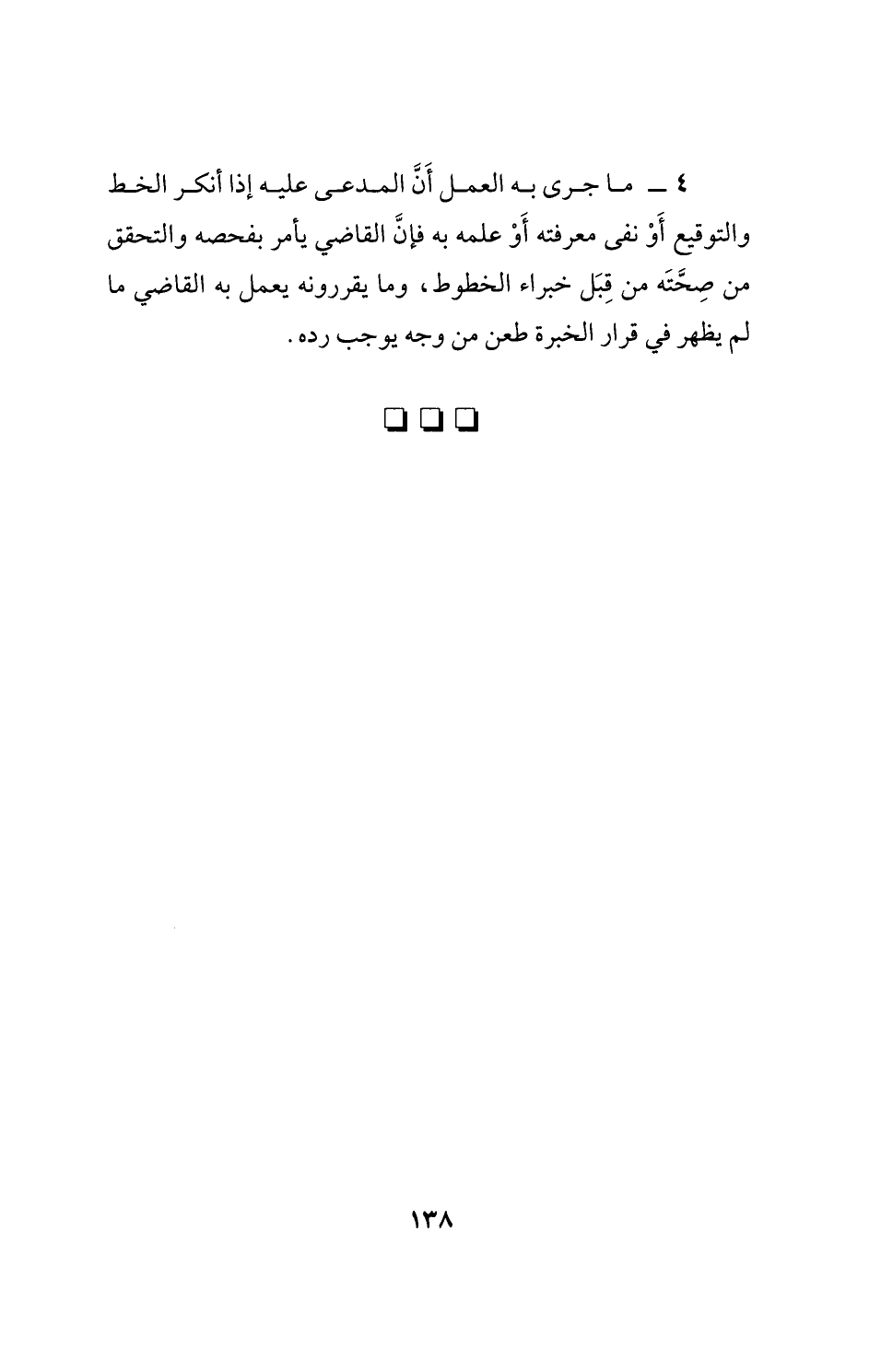 4 - ما جرى به العمل أَنَّ المدعى عليه إذا أنكر الخط والتوقيع أَوْ نفى معرفته أَوْ علمه به فإن القاضي يأمر بفحصه والتحقق من صِحَّتَه من قِبَل خبراء المخطوط، وما يقررونه يعمل به القاضي ما لم يظهر في قرار الخبرة طعن من وجه يوجب رده.