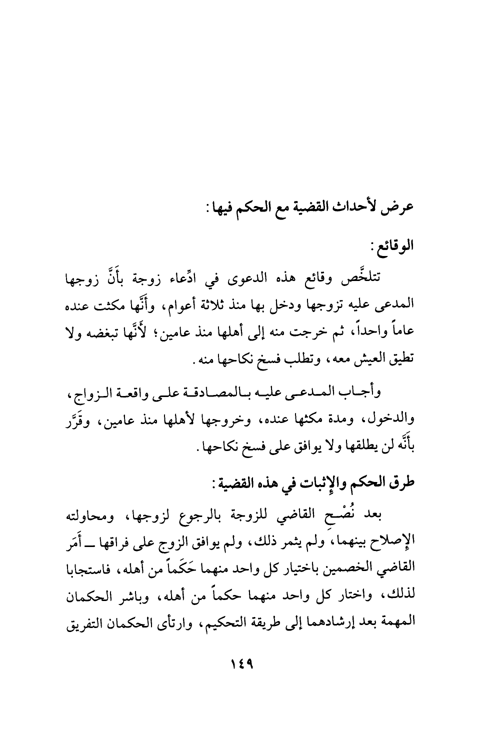 تتلخَّص وقائع هذه الدعوى في ادِّعاء زوجة بأَنَّ زوجها المدعى عليه تزوجها ودخل بها منذ ثلاثة أعوام، وأَنّها مكثت عنده عامًا واحدًا، ثم خرجت منه إلى أهلها منذ عامين؛ لأَنَّها تبغضه ولا تطيق العيش معه، وتطلب فسخ نكاحها منه.