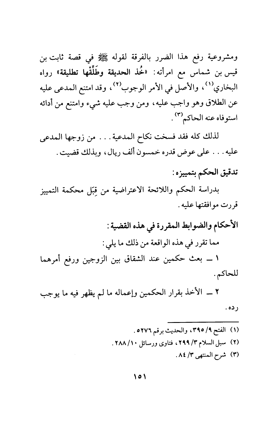 ومشروعية رفع هذا الضرر بالفرقة لقوله - صلى الله عليه وسلم - في قصة ثابت بن قيس بن شماس مع امرأته: "خُذ الحديقة وطَلِّقْها تطليقة" رواه البخاري (¬1)، والأصل في الأمر الوجوب (¬2)، وقد امتنع المدعى عليه عن الطلاق وهو واجب عليه، ومن وجب عليه شيء وامتنع من أدائه استوفاه عنه الحاكم (¬3).